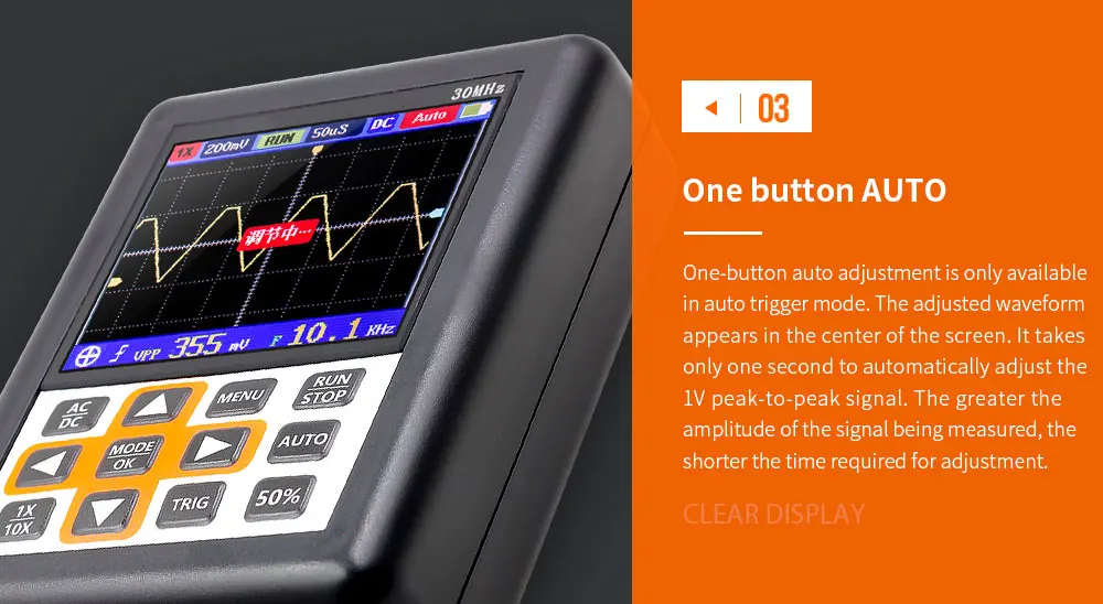 9:Up to 11 parameters measurement:VPP,Vmax,Vmin,Vavg,Vrms,Frequent,Duty+,Duty-,Time+,Time-,Time