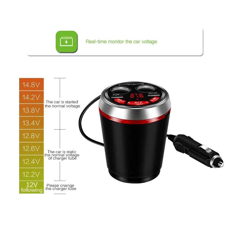 3 in 1 Multifunction cup type car kit: Bluetooth FM transmitter modulator + Dual cigarette lighter socket + Dual USB charger.