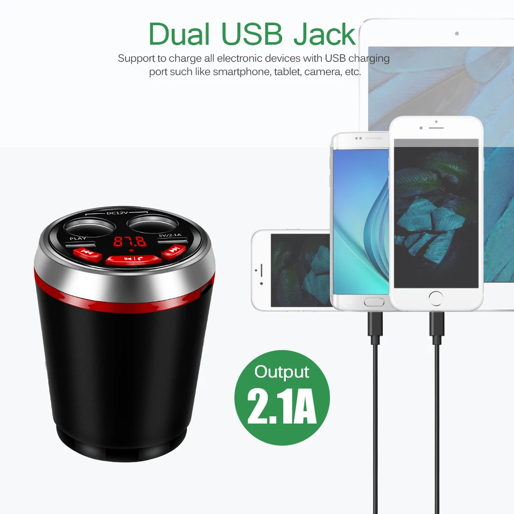 Dual USB Car Charger Cup Cigarette Lighter Socket Charge HUB 12-24V with Bluetooth FM Transmitter Support U Disk Reading