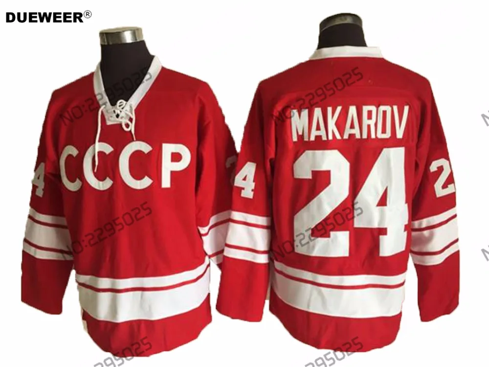 DUEWEER Mens Throwback 24 Sergei Makarov 1980 CCCP Russia Hockey Jerseys Retro Red Stitched Makarov Vintage Shirts