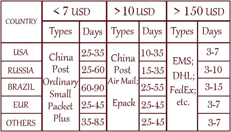Shipping To 48 States Of The U.S.A And Other Countries Is Totally Free, Usually It Takes 12-20 Business Days To Usa, It Will Be Considered As A First Class Mail Once Entered To States. To The Rest Of World We Will Use Post Office’S Registered Mail Service, The Tracking Number We Provided Can Be Traced In Your Country’S Post Office Website, And Usually It Will Take 20-30 Business Days.