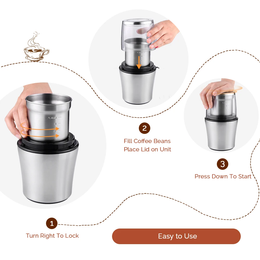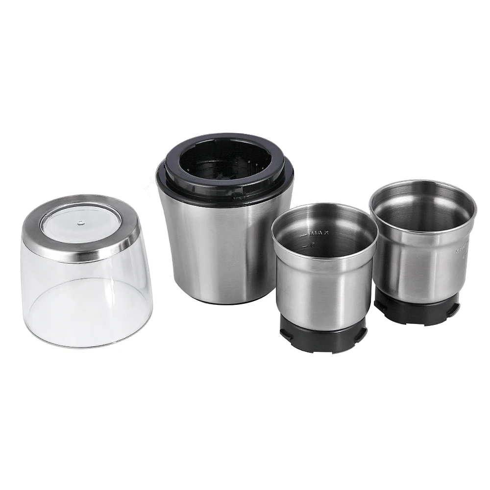3. The coffee bean & spice grinder provides two optional stainless steel removable grinding containers, including one container with two blades and another one with four blades;