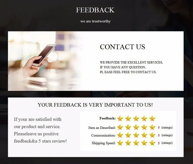 If you have any problems with our items or services, please feel to contact us first before you leave negative feedback. We will do
