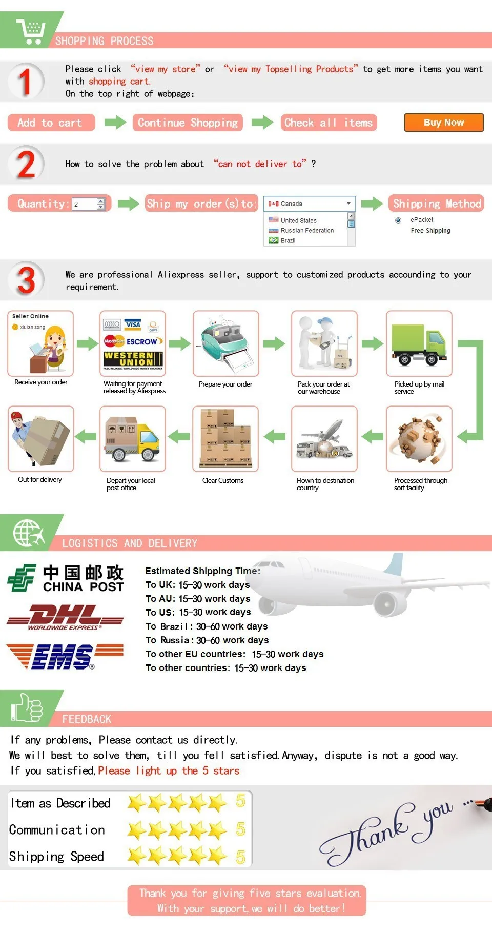 Packages from our warehouse in China will be shipped by ePacket or EMS depending on the weight and size of the product. Packages shipped from our US warehouse are shipped through USPS.
