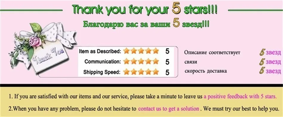 2.Your satisfaction and positive feedback is very important to us. Please leave positive feedback and all 5 stars if you are satisfied with our items and services.