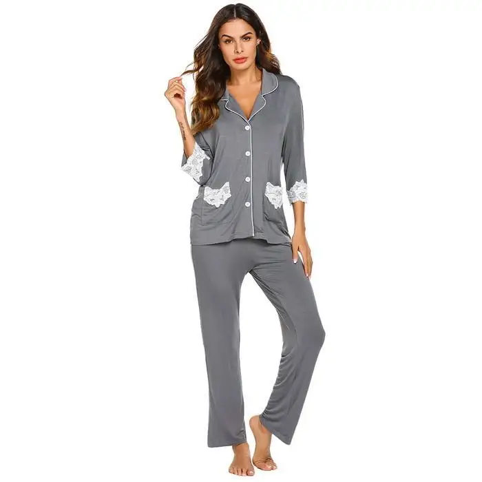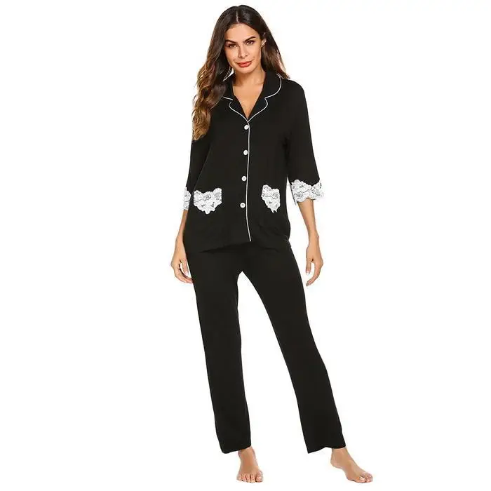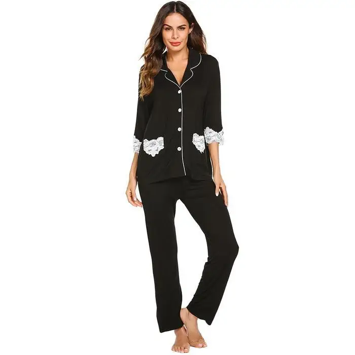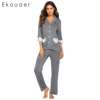 Ekouaer Women Cotton Pajamas Set Nightwear Casual Lace Patchwork Three Quarter Sleeve Shirts Long Pants Pajama Suits Sleepwear