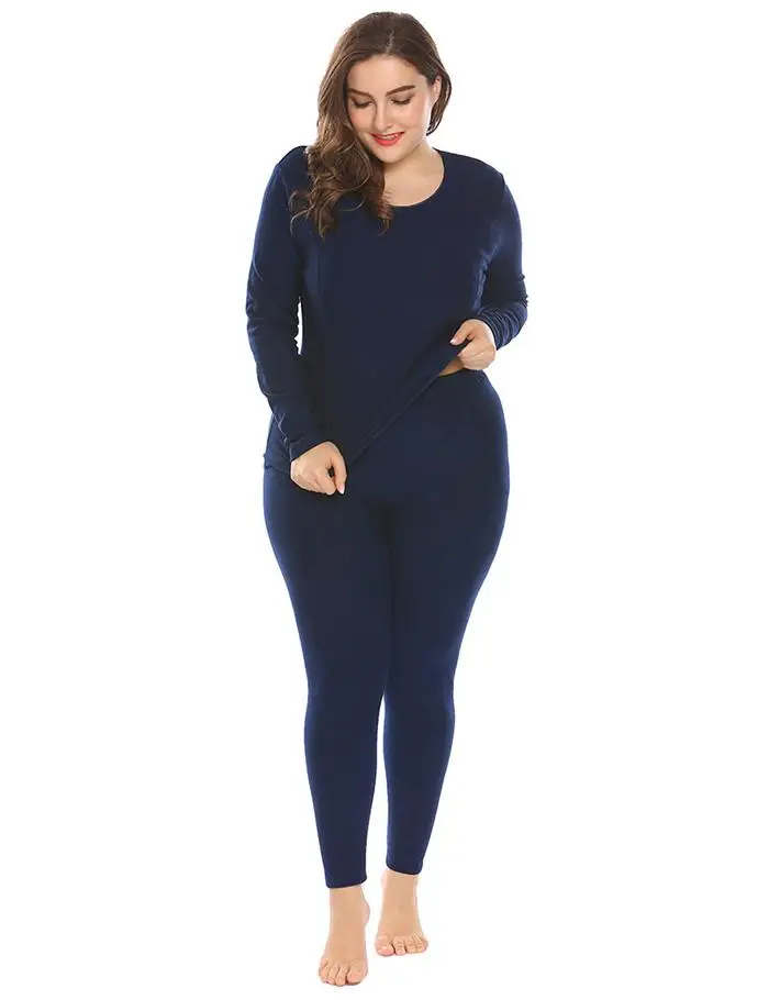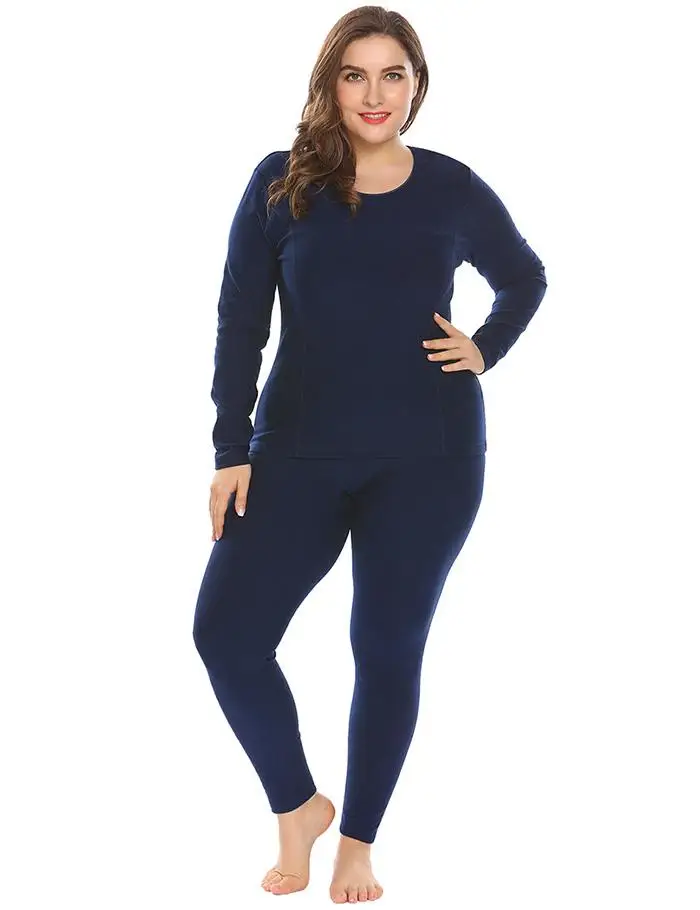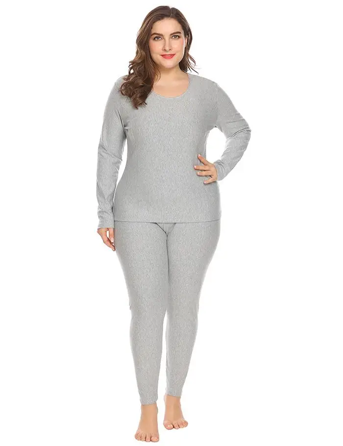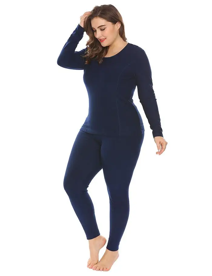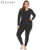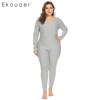 Ekouaer Women Sleepwear Thermal Nightwear Set Solid Top and Sleep Bottom Fleece Lined Plus Size Pajamas Female Home Clothing