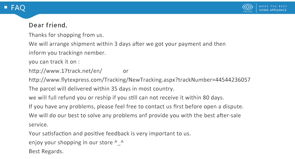 • If you did not receive the product within the guaranteed time( 45 days not including 2-5 day processing) you can request a refund or a reshipment.