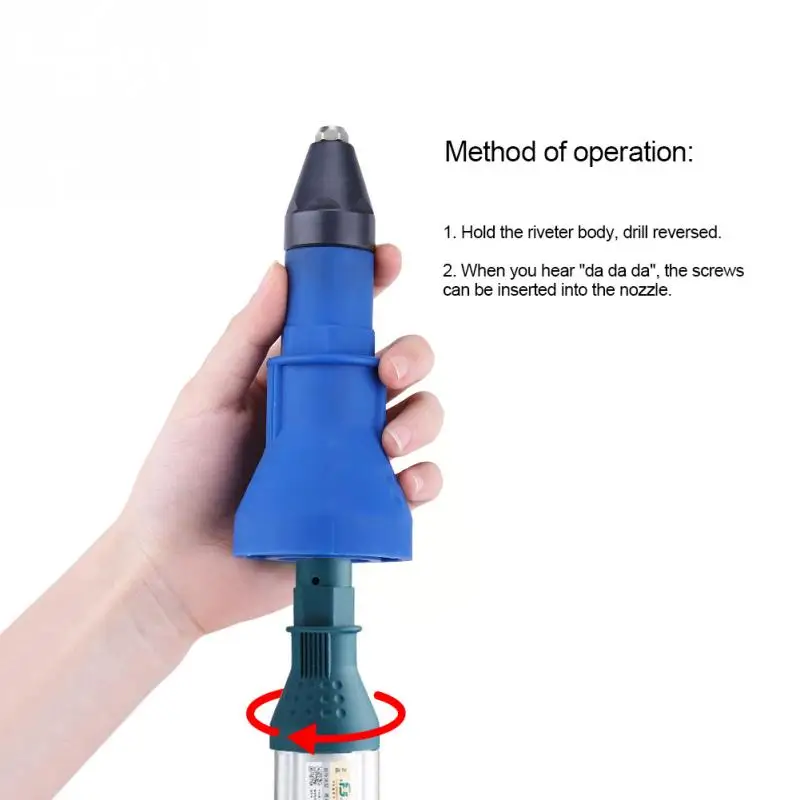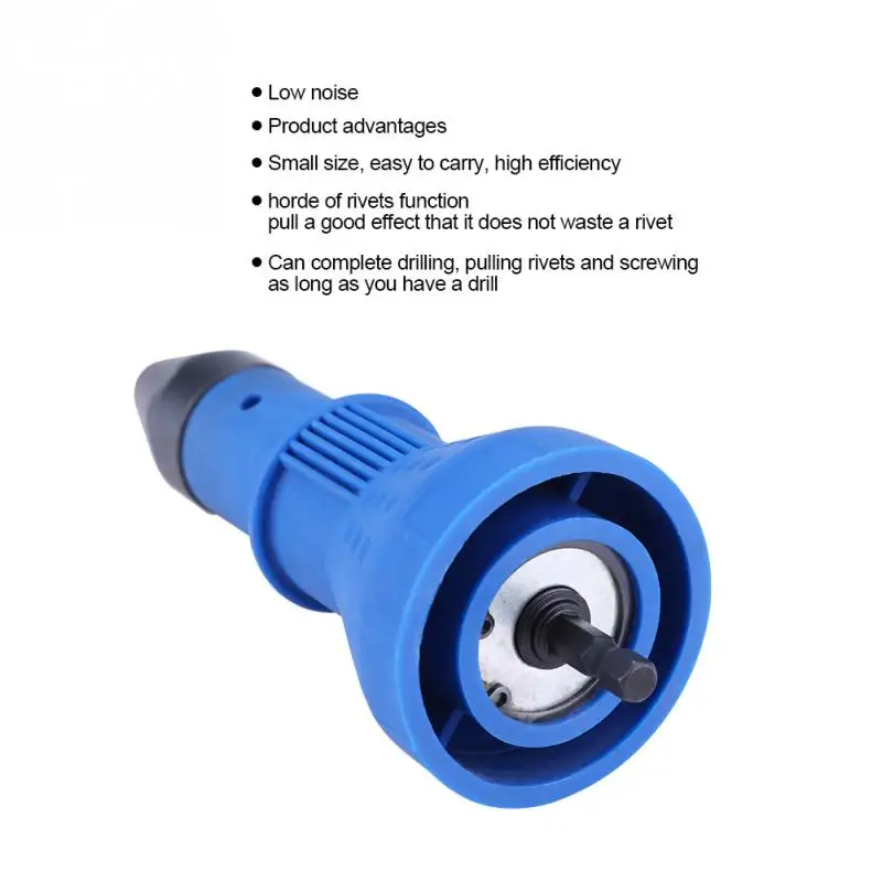 Traditional electric rivet gun is heavy, not portable, noisy and drop rivets. The internal structure is easily damaged. Hand riveters is laborious and inefficient. While this electric rivet gun has small size, lower noise and easy to carry, more efficient. A horde of rivets function, pull a good effect that it does not waste a rivet. Can complete drilling, pulling rivets and screwing, as long as you have a drill.
