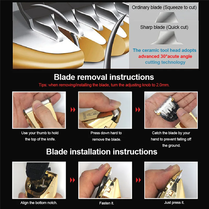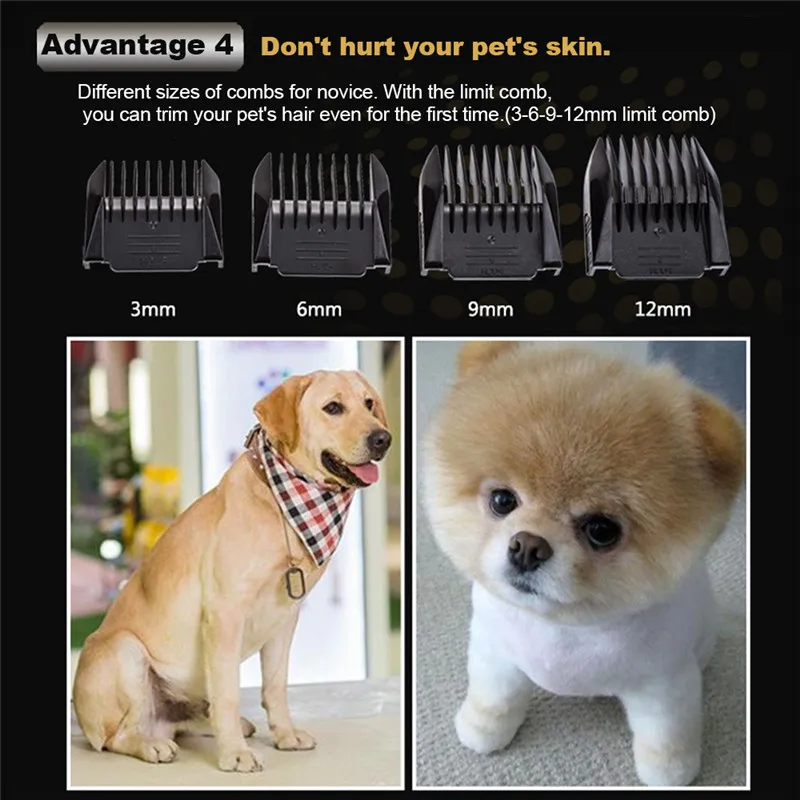 • The cllipper itself has 5 adjustable functions for the comb from 0.8mm to 2mm. With 4 attachment guide combs: thinning-out, (3mm/6mm/9mm/12mm,) skin-friendly contour-following combs make it safe, easy, comfortable.