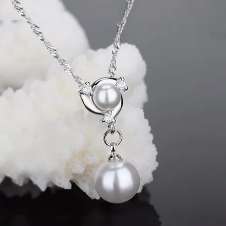 Elegant Fashion 925 Sterling Silver Chain Double Pearls Necklace Cubic Zirconia Crystal Necklaces for Women Girl Wedding Jewelry