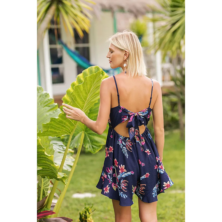 ELLENBEETLE Women Summer 2018 Beach Floral Boho Jumpsuits & Rompers Loose Printing Sexy Off the Lace Flash Neck Mini Rompers