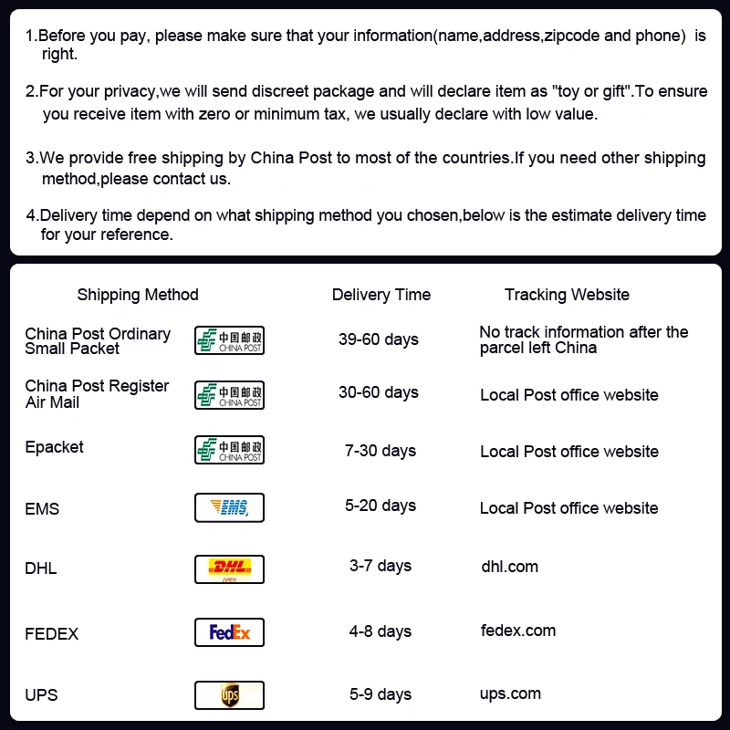 Packages from our warehouse in China will be shipped by ePacket or EMS depending on the weight and size of the product. Packages shipped from our US warehouse are shipped through USPS.