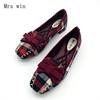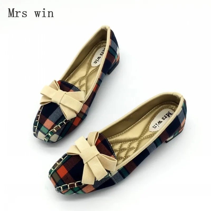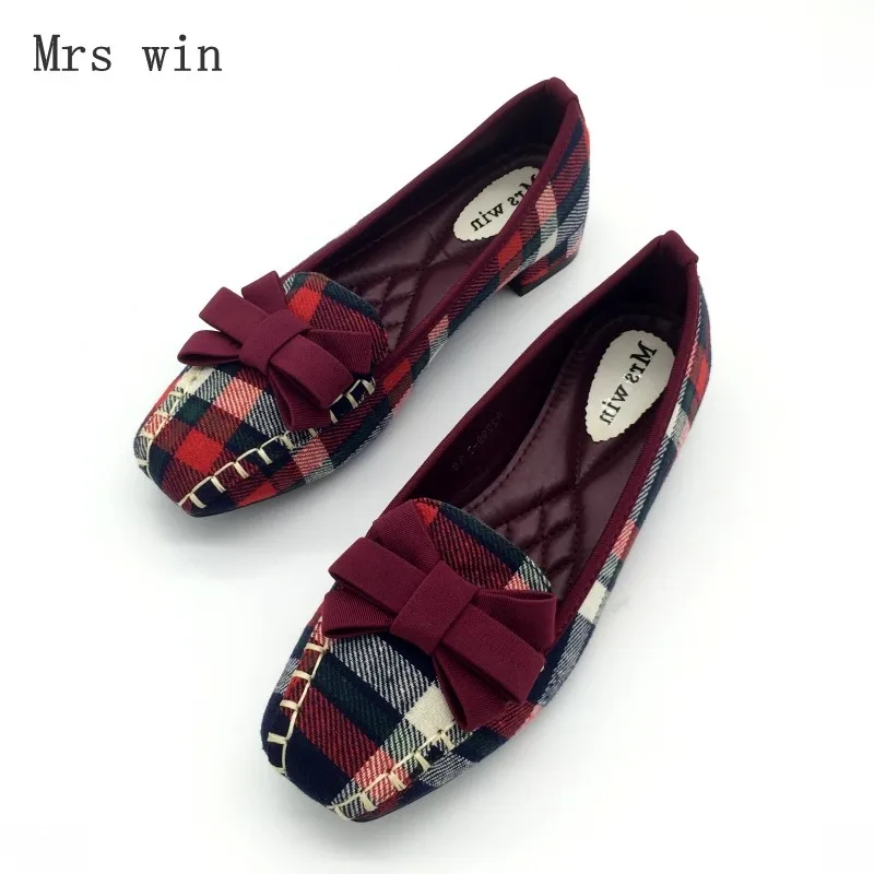 England Style Gingham Women Casual Loafers Spring Autumn Square Toe Bowtie Slip On Flats For Woman Ladies Single Shoes Plus Size