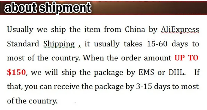 Packages from our warehouse in China will be shipped by ePacket or EMS depending on the weight and size of the product. Packages shipped from our US warehouse are shipped through USPS.