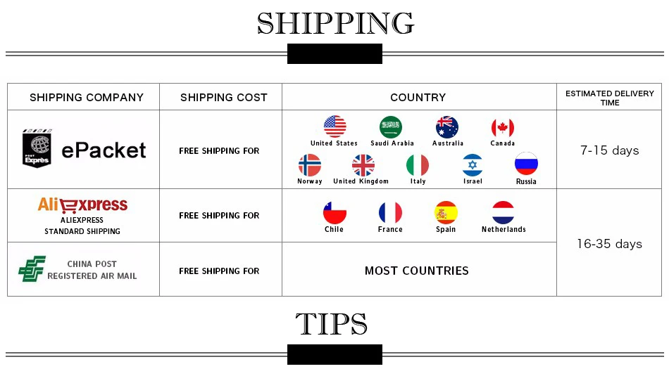 Packages from our warehouse in China will be shipped by ePacket or EMS depending on the weight and size of the product. Packages shipped from our US warehouse are shipped through USPS.