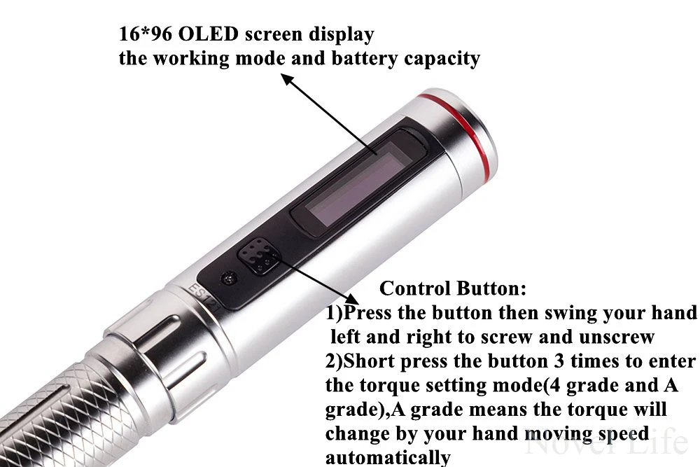 4)Equipepd with SMT32 MCU and 3-axis gyro sensor with motion control enable the user to screw or unscrew just by a thumb slight moment
