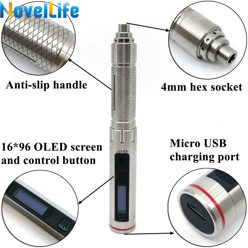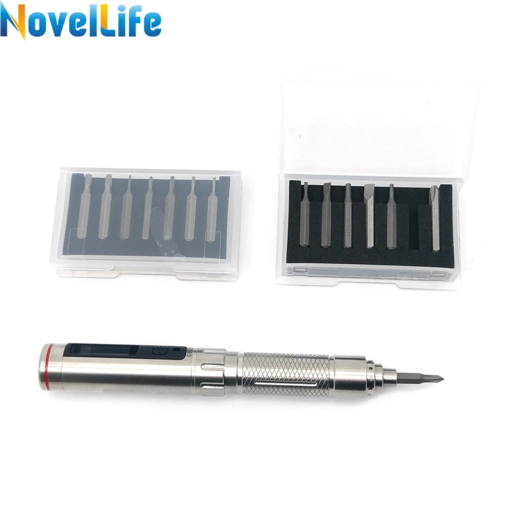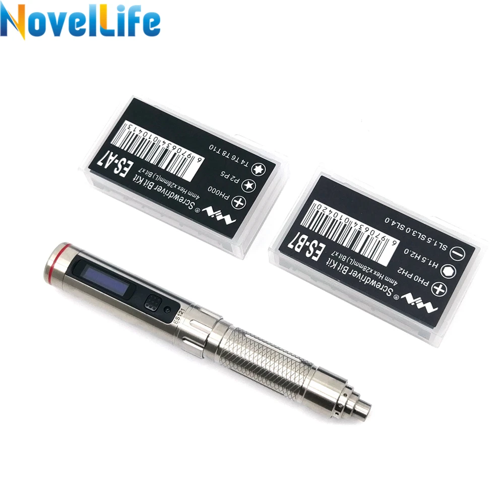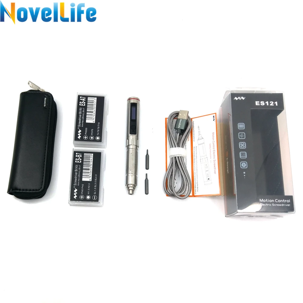 This is the ES121 whole set including ES121 small power screwdriver, ES-A7 and ES-B7 screw driver bit set,portable pouch and coustomized high quality USB charging cable.ES121 is equipped with 1:64 reduction gear motor(ES120 is 1:144) ensure larger rotation speed up to 380 RPM load-free(ES120 is 170RPM) .Slim 304 stainless steel housing with pen shape design,powered by 300mAh lipo battery with 30 minutes working time continuously at full load. It is equipped with SMT32 MCU and 3-axis gyro supporting motion control enable the user to screw or unscrew just by a thumb slight moment, so intelligent and convenient. 16X96mm OLED display the working status and standard 4mm diameter socket compatible most most precision screwdriver bits.Come along with a portable pouch enable you to easy to store and carry the screwdriver and the bits, a great helper for electronic reparing projects