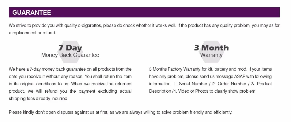 • If you did not receive the product within the guaranteed time( 45 days not including 2-5 day processing) you can request a refund or a reshipment.