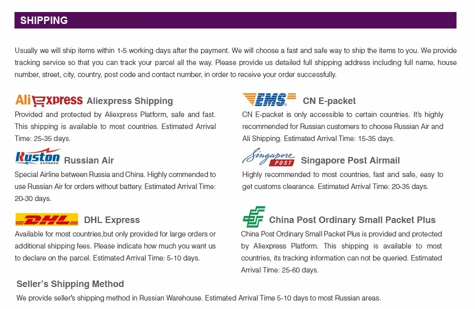 Packages from our warehouse in China will be shipped by ePacket or EMS depending on the weight and size of the product. Packages shipped from our US warehouse are shipped through USPS.