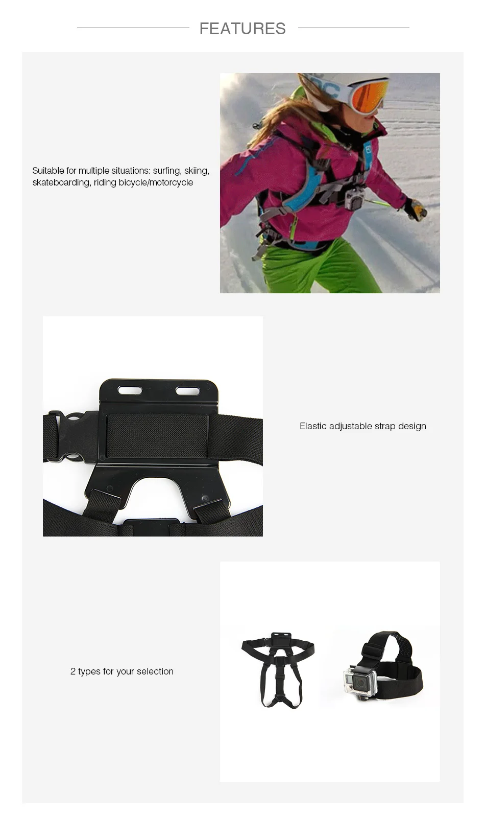 This fixed strap is designed for Gopro. And it suits for multiple situations surfing, skiing, skateboarding, riding bicycle/motorcycle. 2 types for you to choose from.