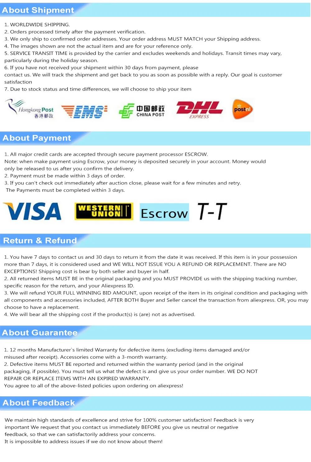 We are not responsible for any custom fees once the items have shipped. By purchasing our products, you consent that one or more packages may be shipped to you and may get custom fees when they arrive in your country.