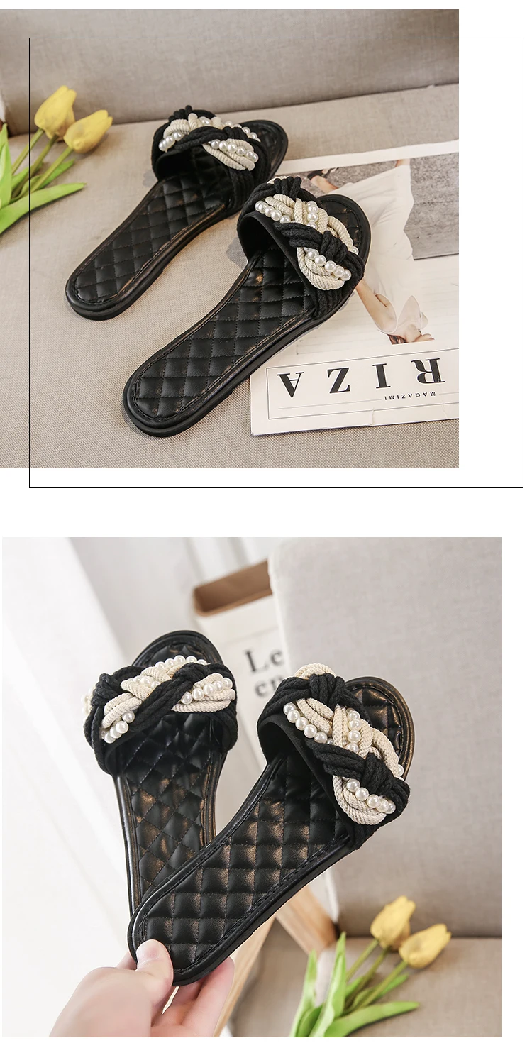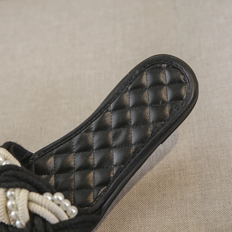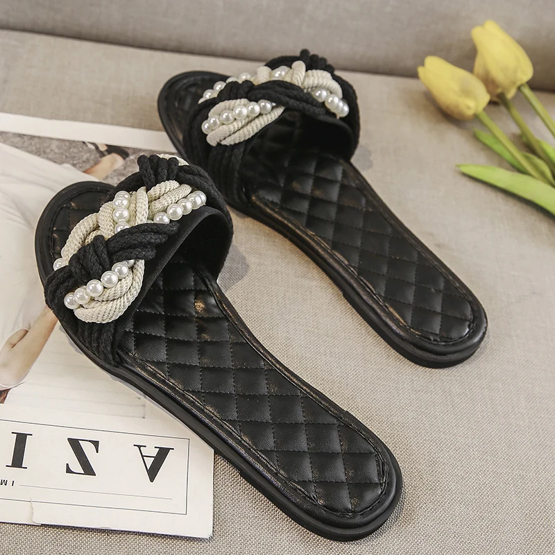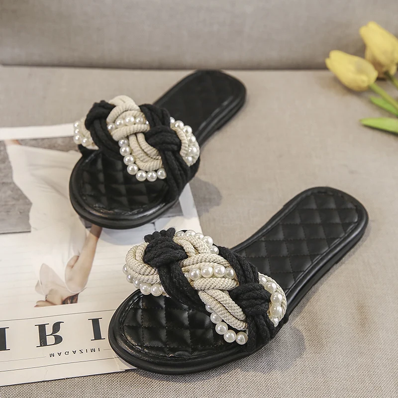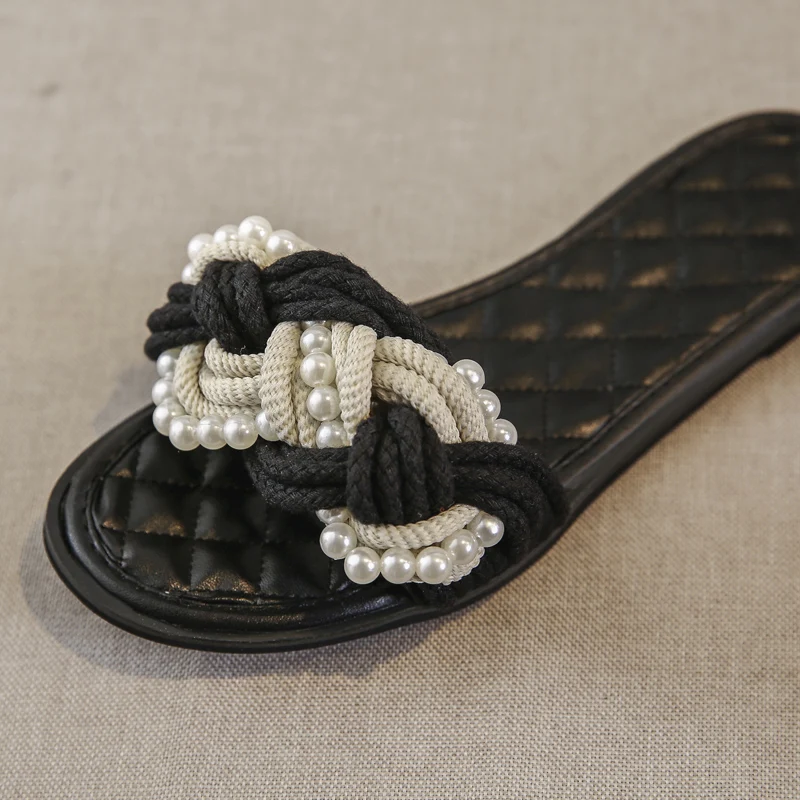 European Brand Beaded Sandals Women Plaid Slides Shoes Summer Hemp Rope Slippers Pearl Beading Flipflops Roma Knitted Sandalias