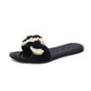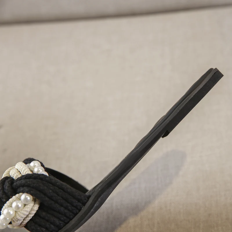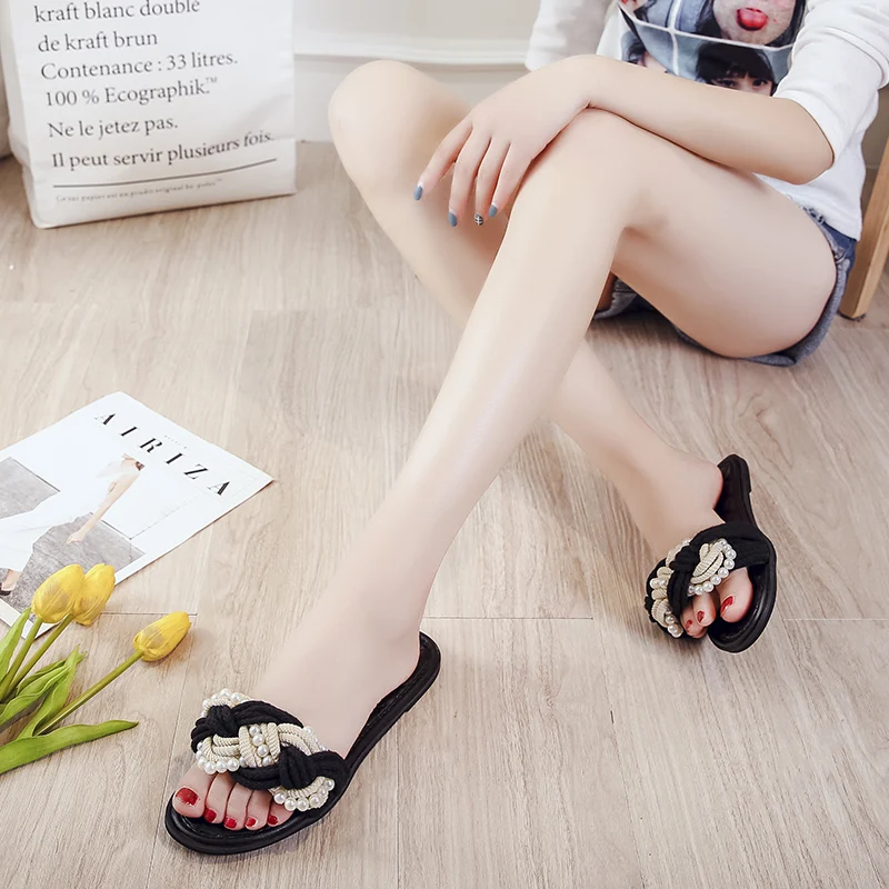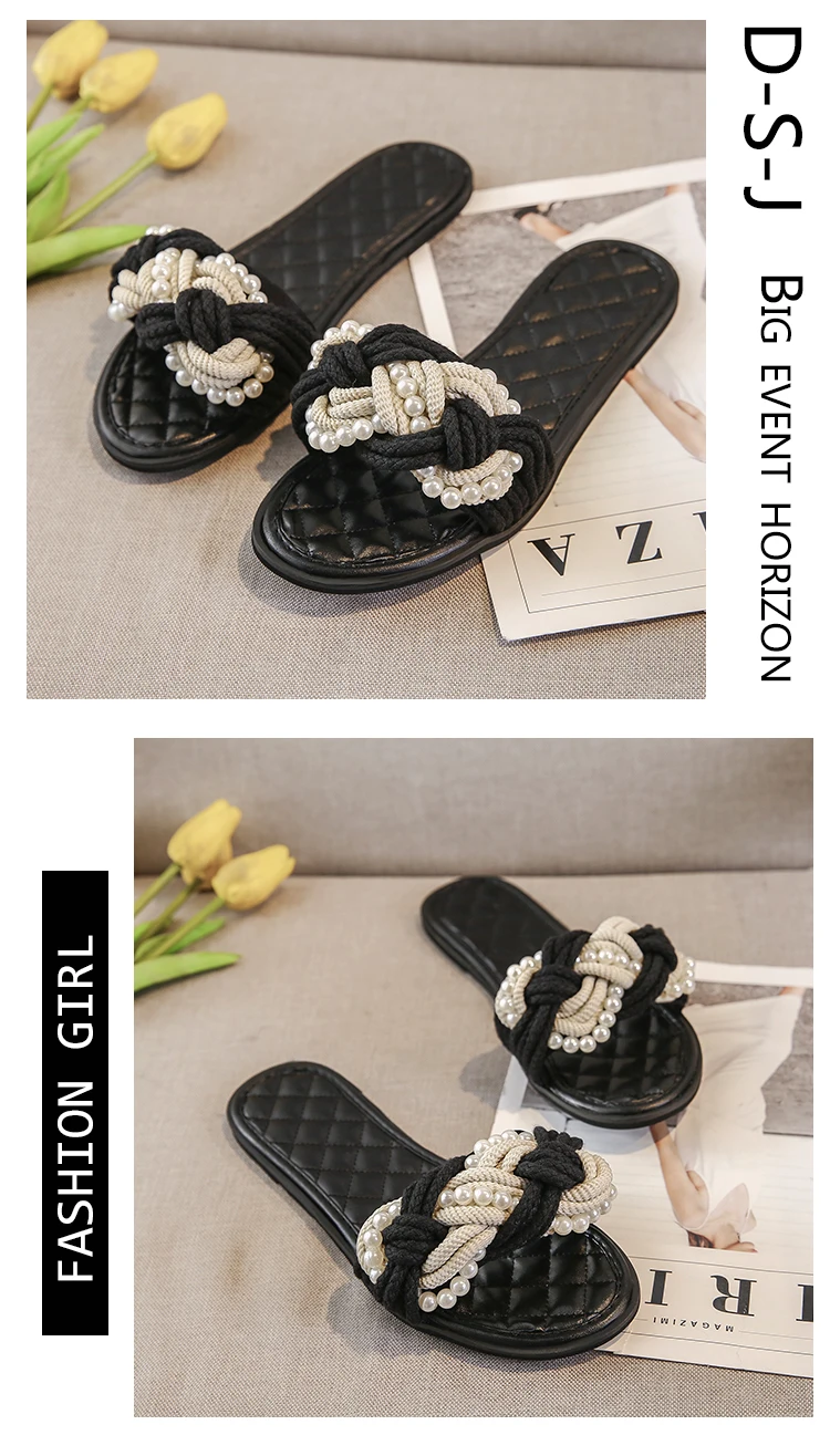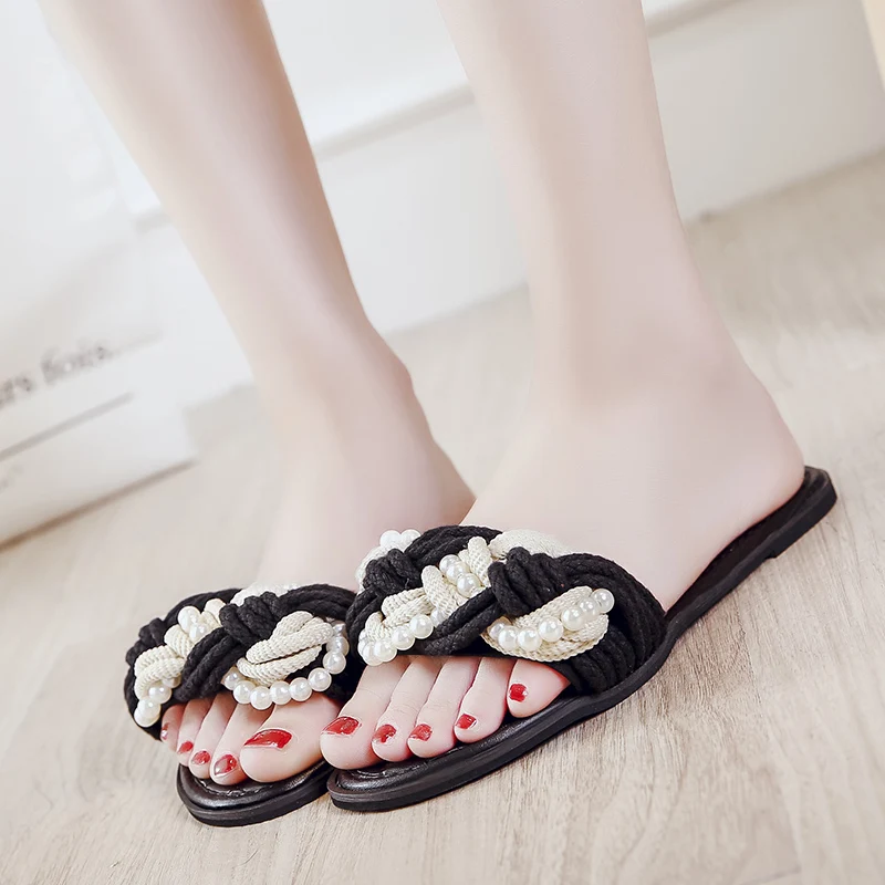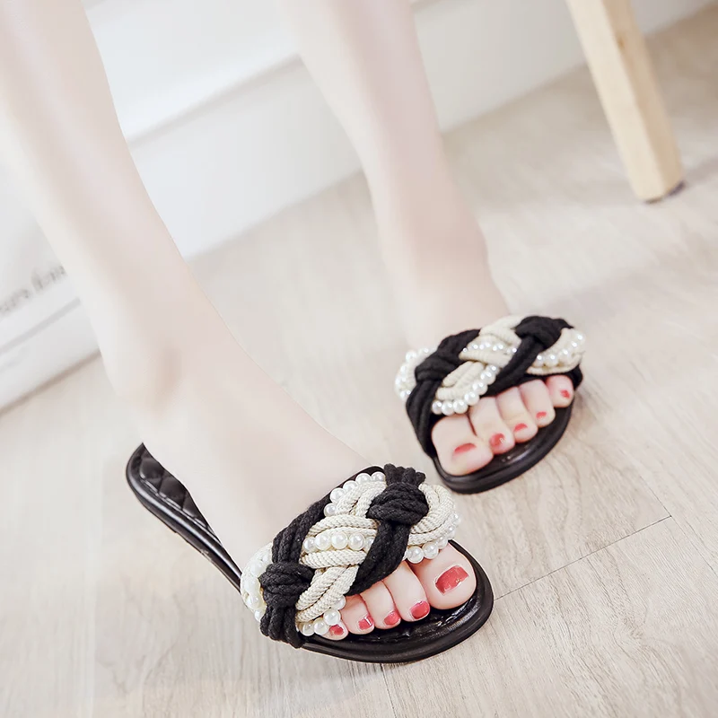 European Brand Beaded Sandals Women Plaid Slides Shoes Summer Hemp Rope Slippers Pearl Beading Flipflops Roma Knitted Sandalias