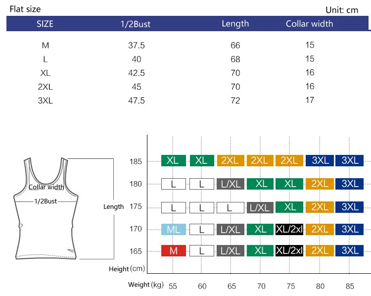3XL: 1/2 Bust 47.5 cm. Length 72 cm. Collar width 17 cm.