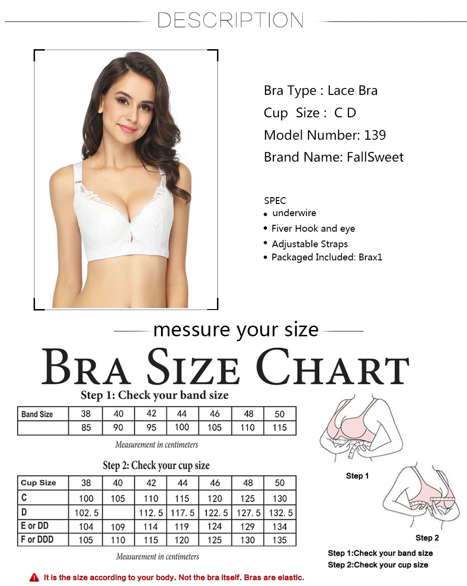 • Band Size :34=75 36 =80 38=85 40=90 42=95 44=100 46=105 48=110 50=115
