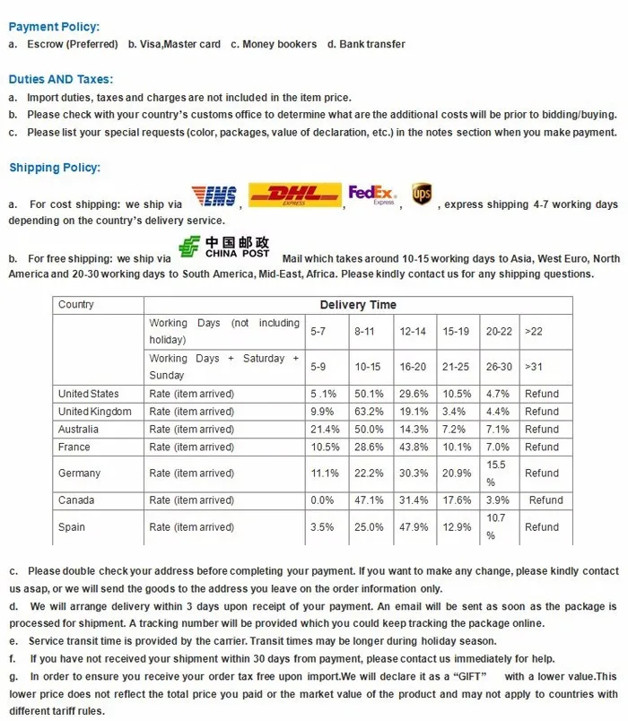 • If you did not receive the product within the guaranteed time( 45 days not including 2-5 day processing) you can request a refund or a reshipment.