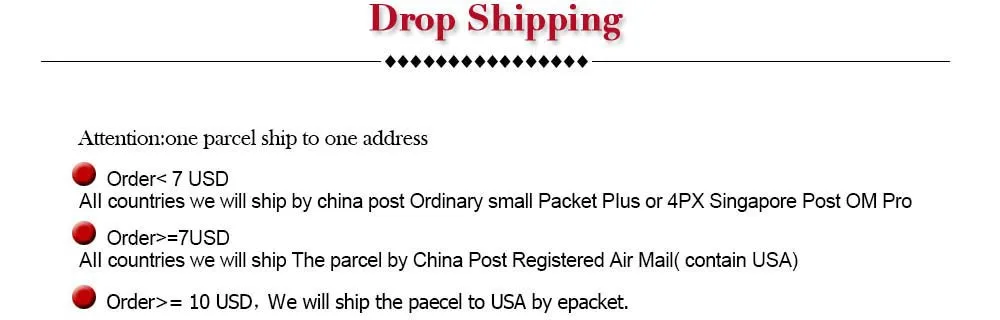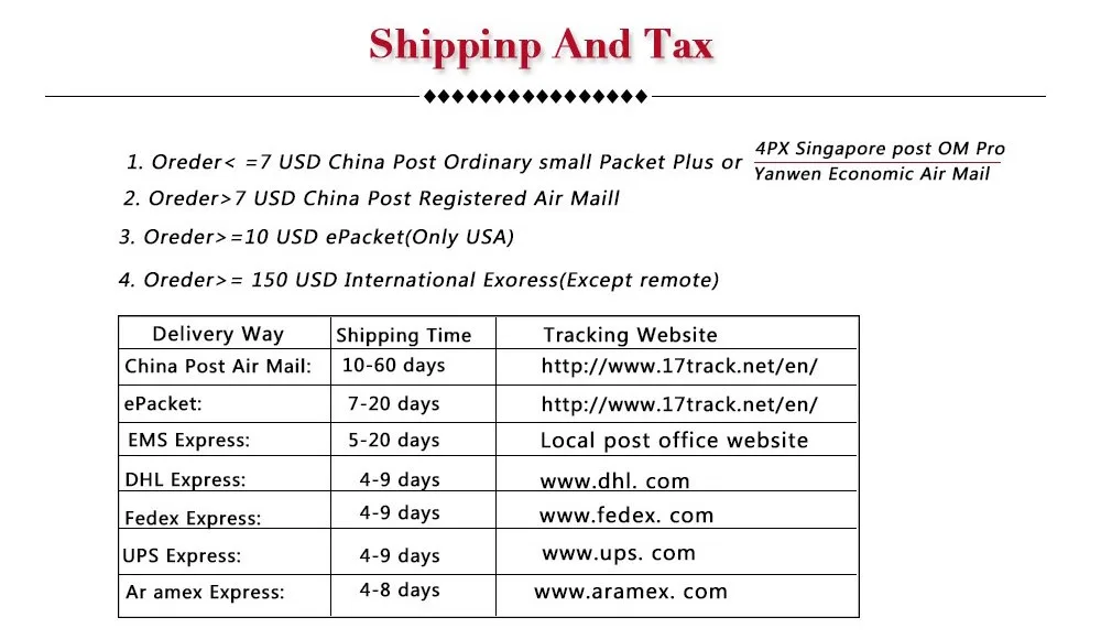 Packages from our warehouse in China will be shipped by ePacket or EMS depending on the weight and size of the product. Packages shipped from our US warehouse are shipped through USPS.