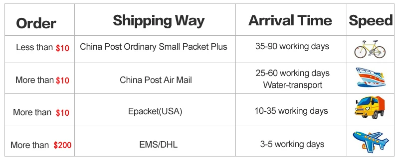 Packages from our warehouse in China will be shipped by ePacket or EMS depending on the weight and size of the product. Packages shipped from our US warehouse are shipped through USPS.