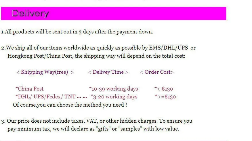 We are not responsible for any custom fees once the items have shipped. By purchasing our products, you consent that one or more packages may be shipped to you and may get custom fees when they arrive in your country.