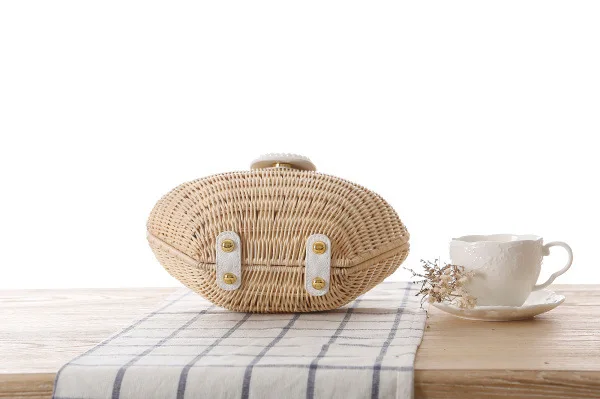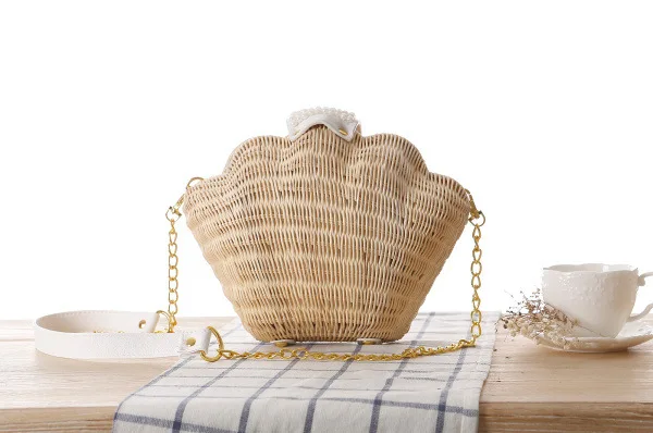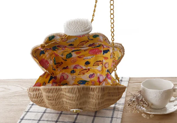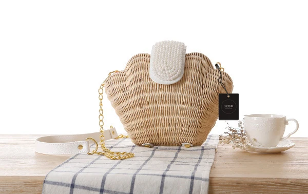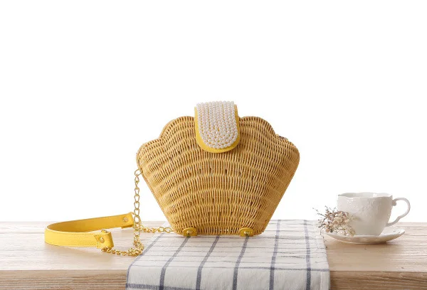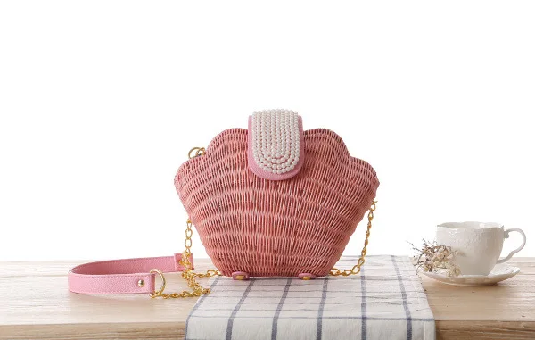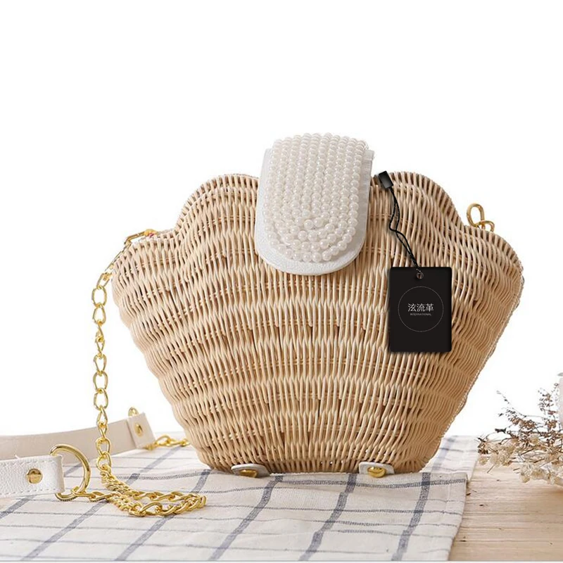Fashion Pearl Handbag Nature Rattan Shell Handmade Shoulder Women Beach Bag Weave Straw Tote Girls Travel Bag Bolsas
