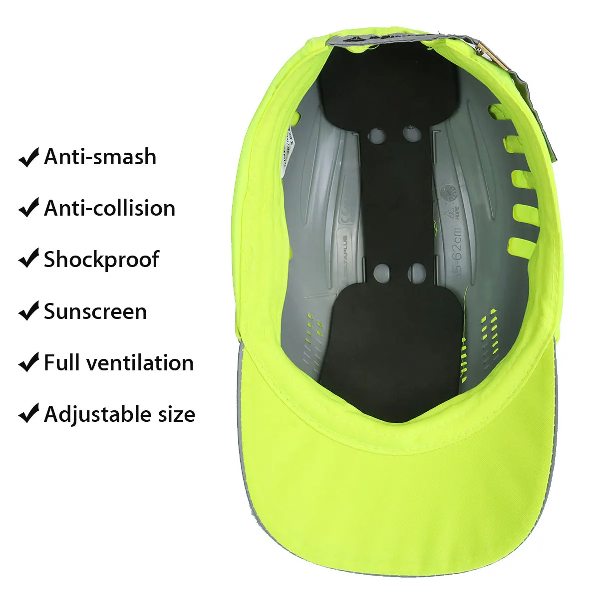 Impact-resistant baseball style bump cap. Very ventilated polyester/cotton with mesh fabric. Lined with polyethylene and comfortable EVA foam shell to absorb shocks. Adjustable single size by buckle 55-62 cm.