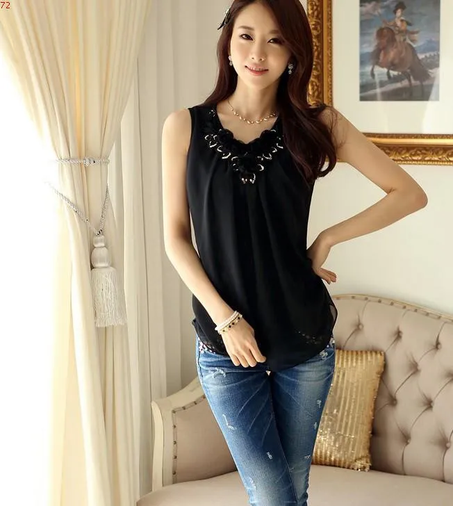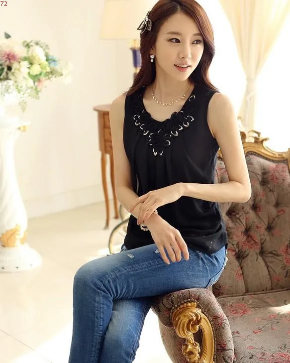 fashion Women blouses summer tops applique sleeveless loose vest white chiffon blouse women shirts plus size clothes 5XL 6XL