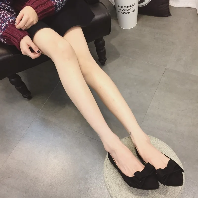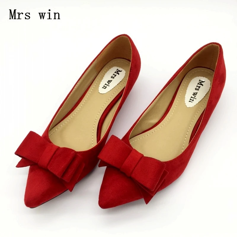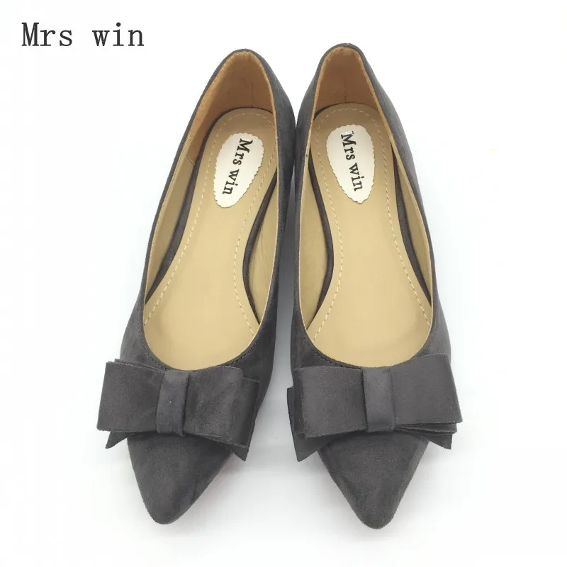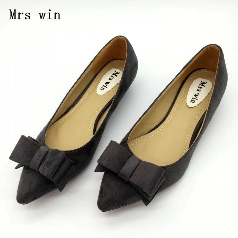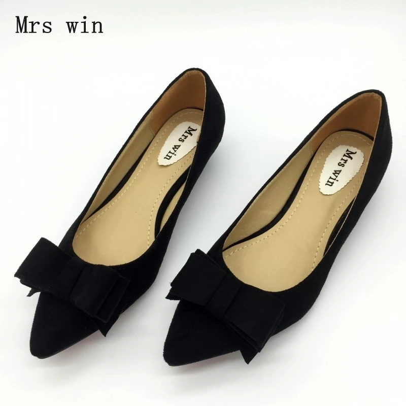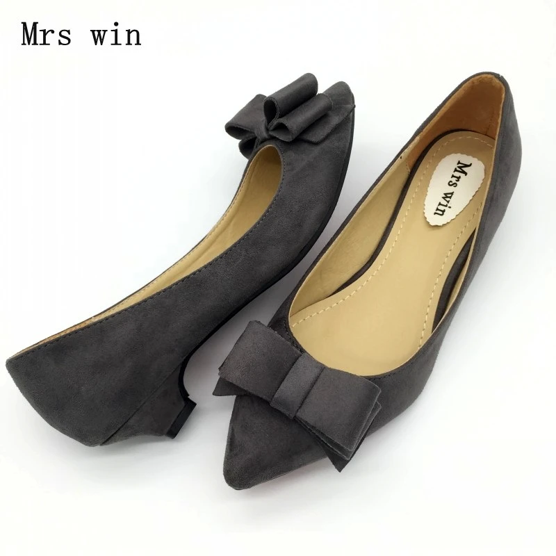 Fashion Women Low Heel Pumps Shoes Spring Autumn Flock Pointed Toe Bowtie Slip On Woman Casual Spike Heel Single Shoes Plus Size