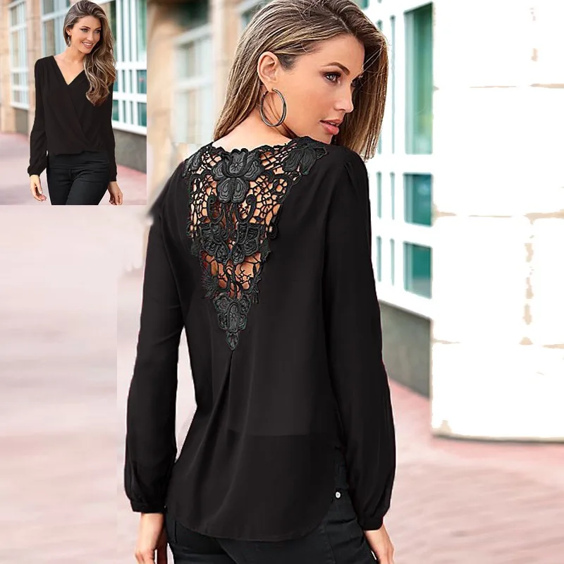 Fashionable Women’s Office Lady Shirt Chiffon Solid Top Back Lace Hollow Out Top Puff Sleeve Feminist Blusa Renda Vintage Lace