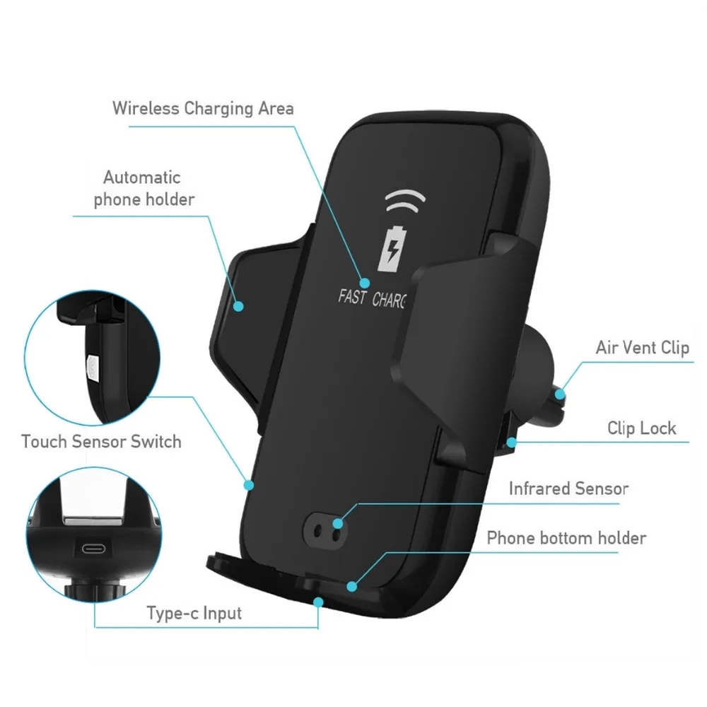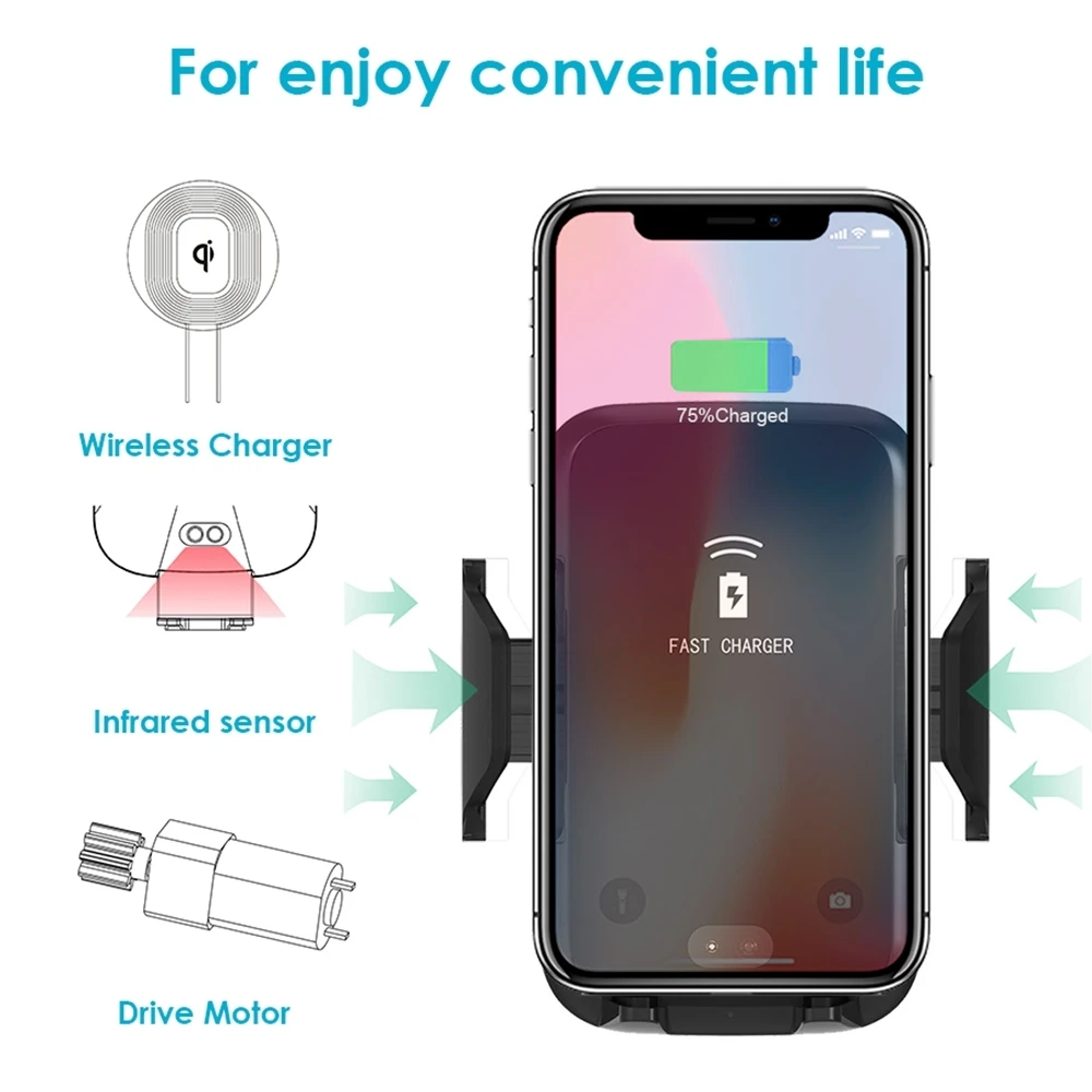 Fully Automatic and One-hand Operation: Equipped with advanced infrared motion sensors and motors, this fast wireless car charger’s clamps will open and close automatically once your phone approaches. You can put your phone on the wireless charger car mount to hold and charge your phone simply with one hand. Touch the metal button on the car phone charger’s left side, the clamps will automatically open for you to take your phone out with only one hand.