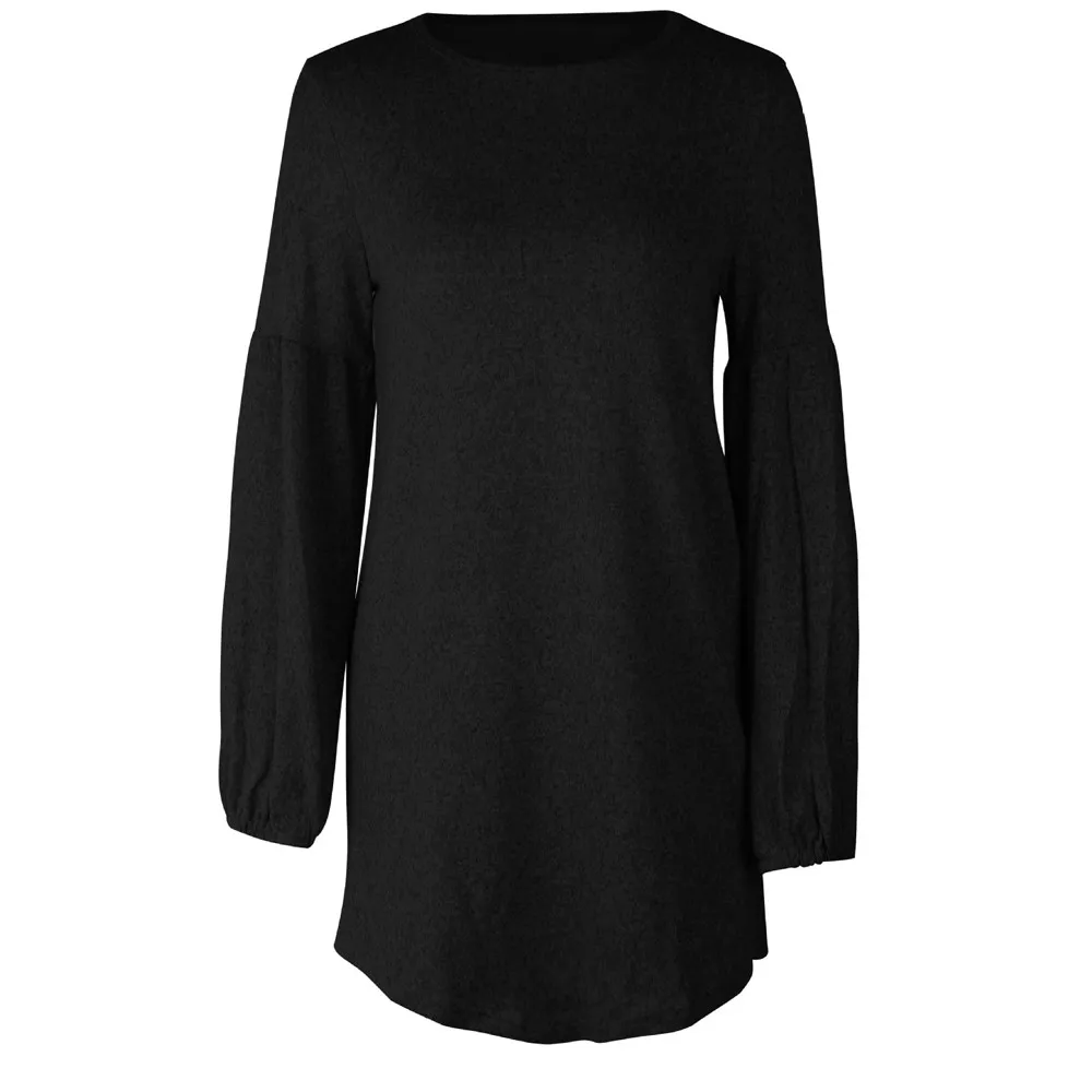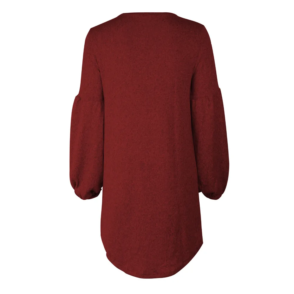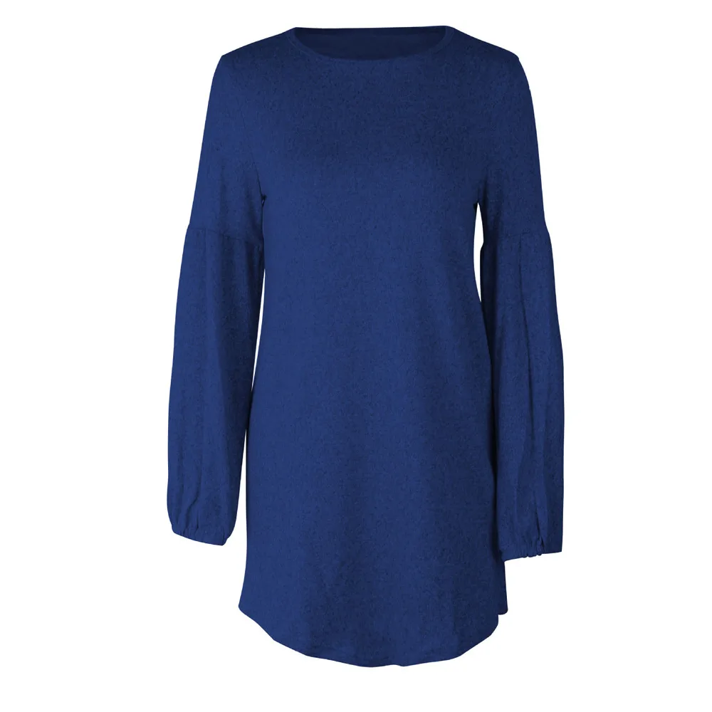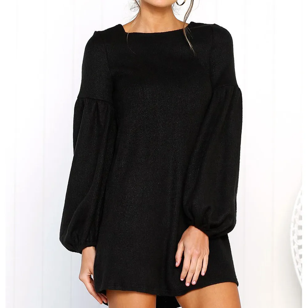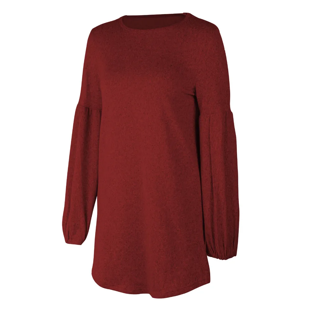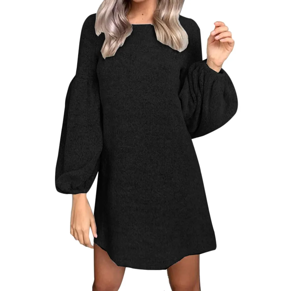 Women Fashion Solid Long Sleeve O-Neck Puff Sleeve Knitted Dress
