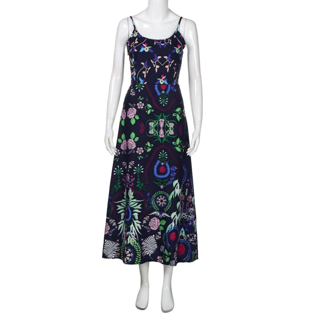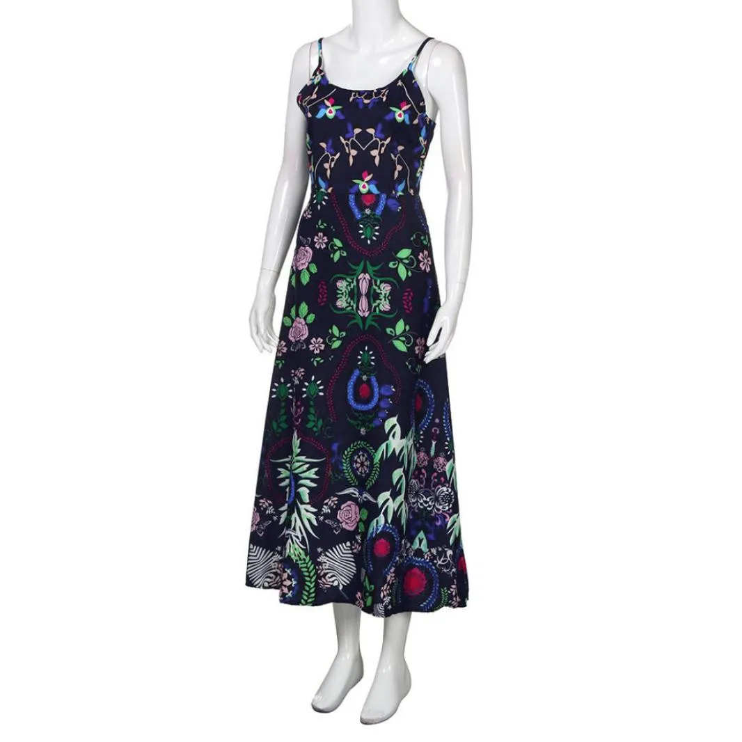 Bohemian Womens Floral Print Sling Long Dress Sleeveless Summer Beach Dress