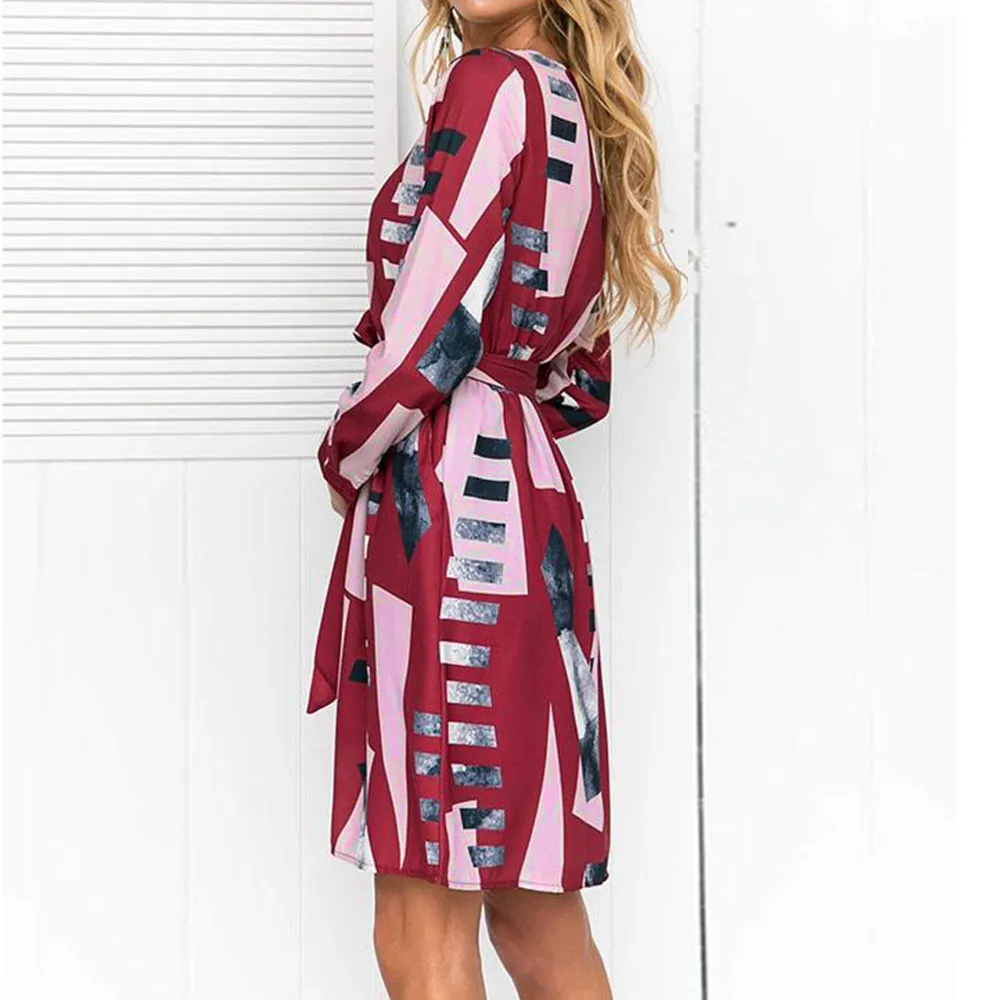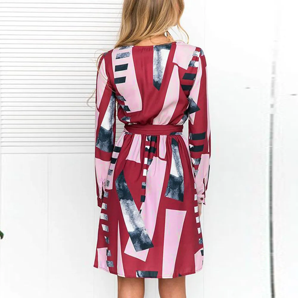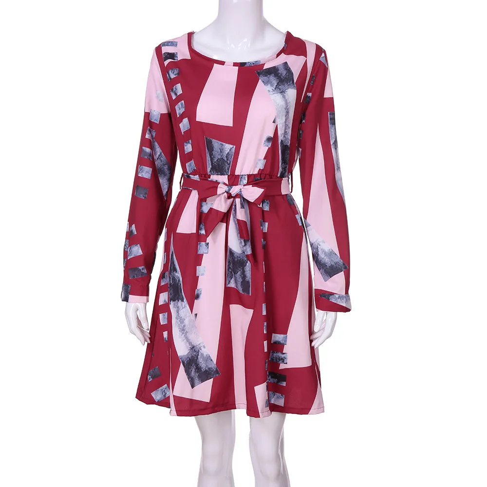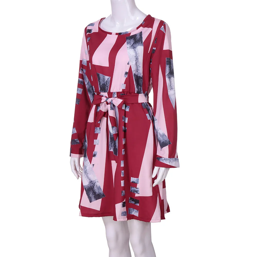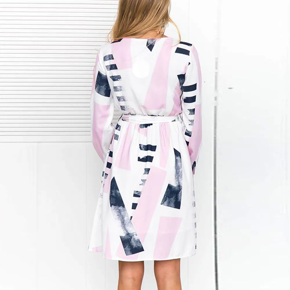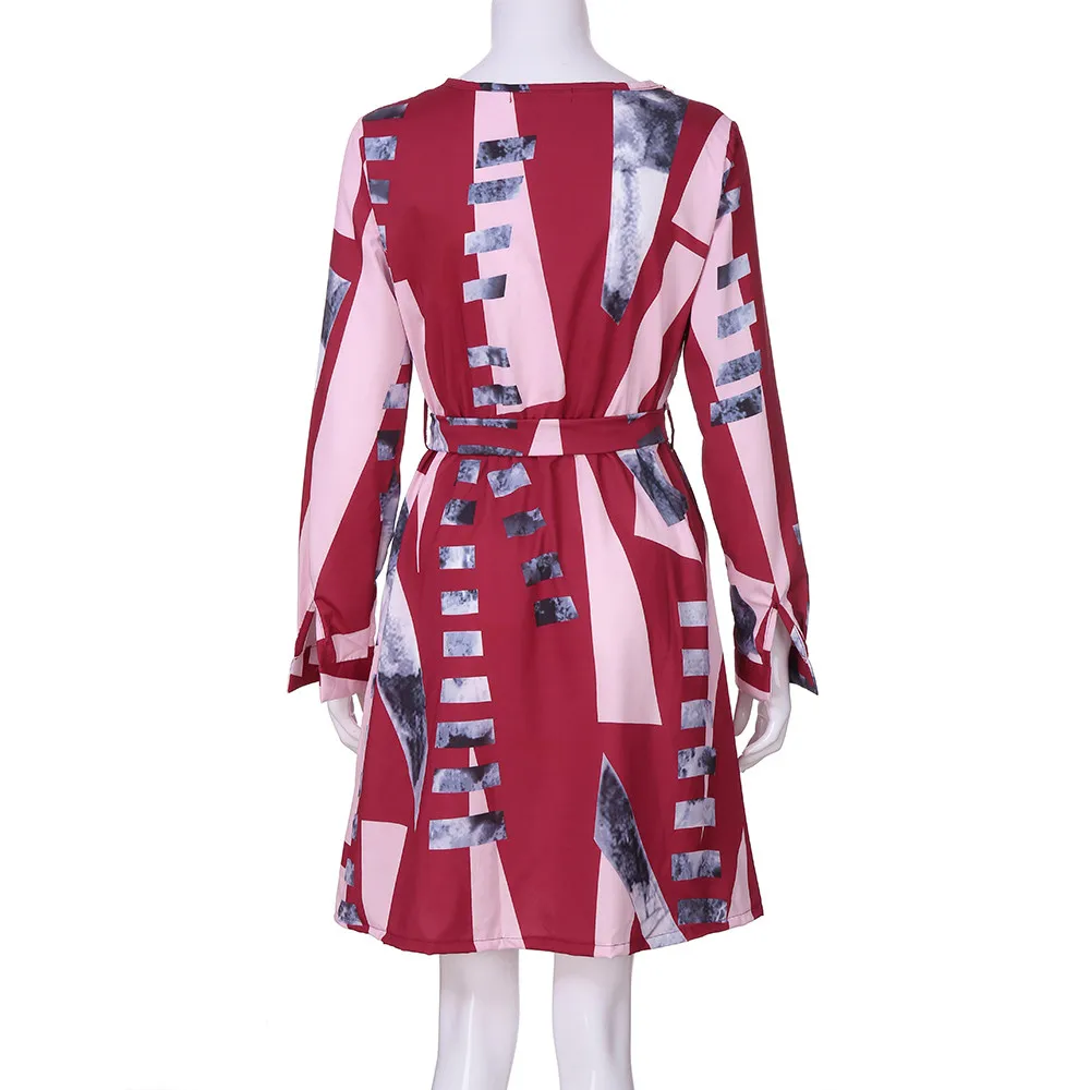 FeiTong Elegant geometric dress women Long sleeves sash wrap dress shirt 2018 Autumn winter O neck sexy female dress vestidos