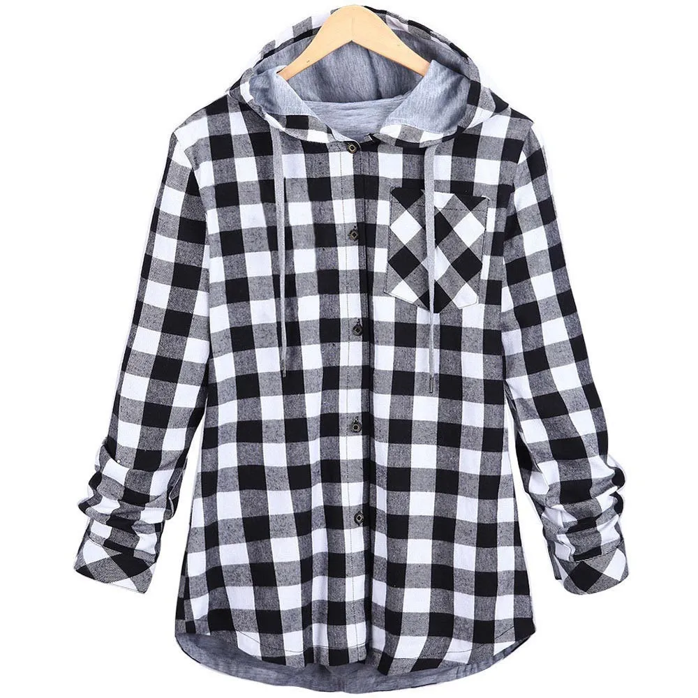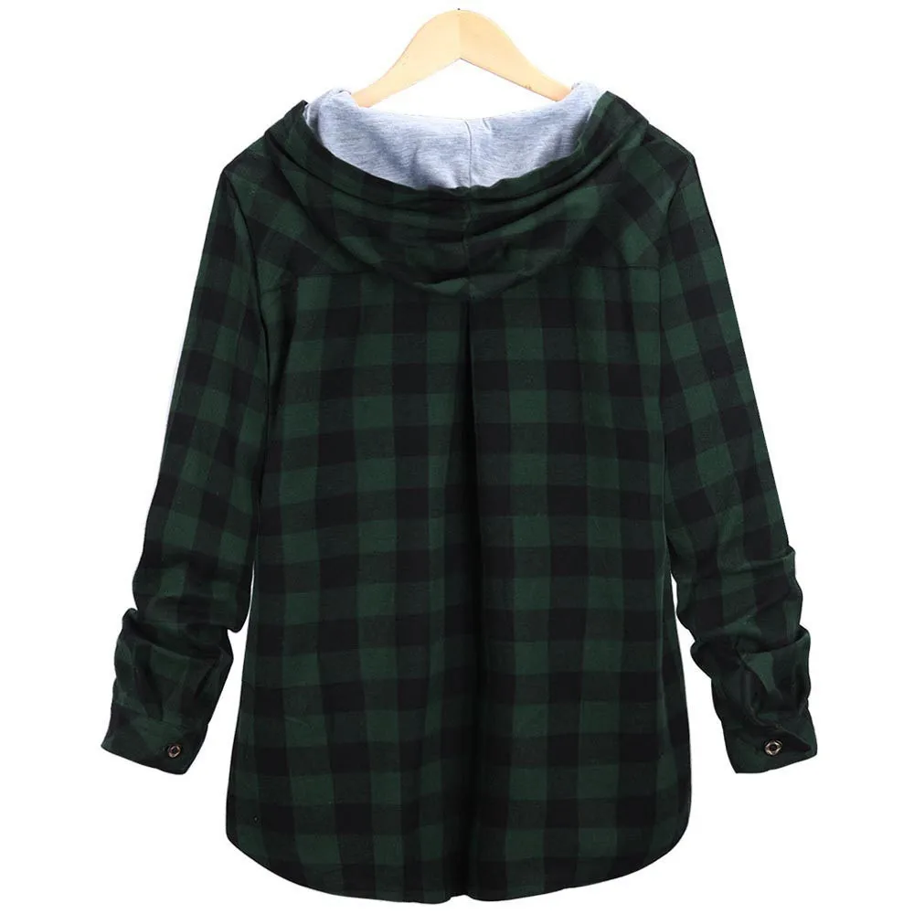 Women’s Long Sleeve Plaid Hooded Cardigan Jacket Blouse