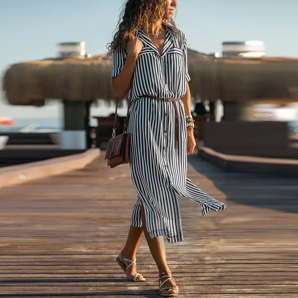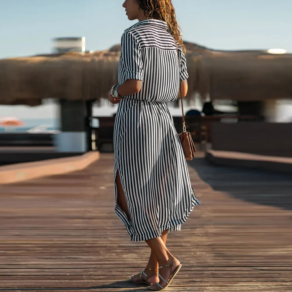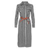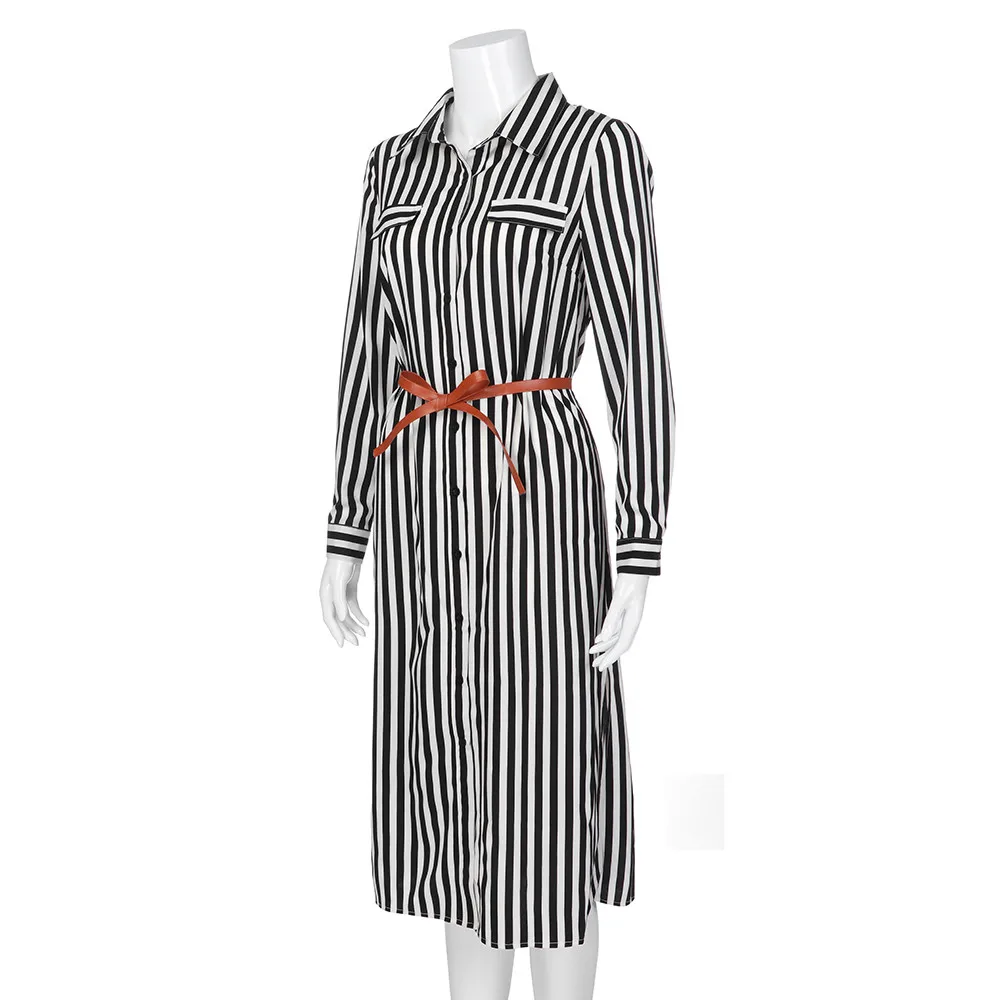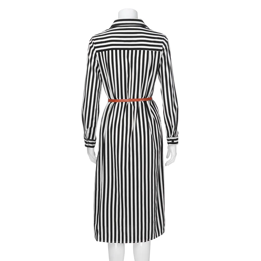 Women Stripe Printed Long Sleeves Button Bandage Belt Shirt Long Dress