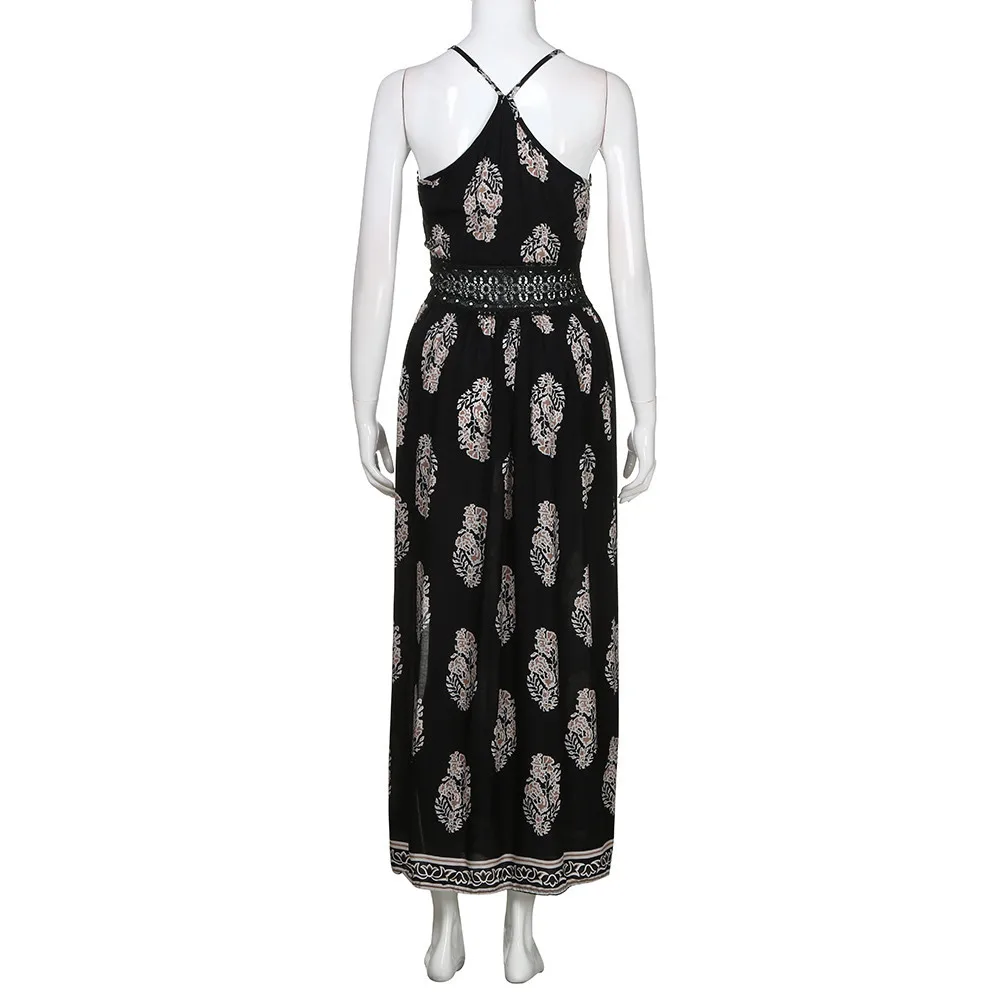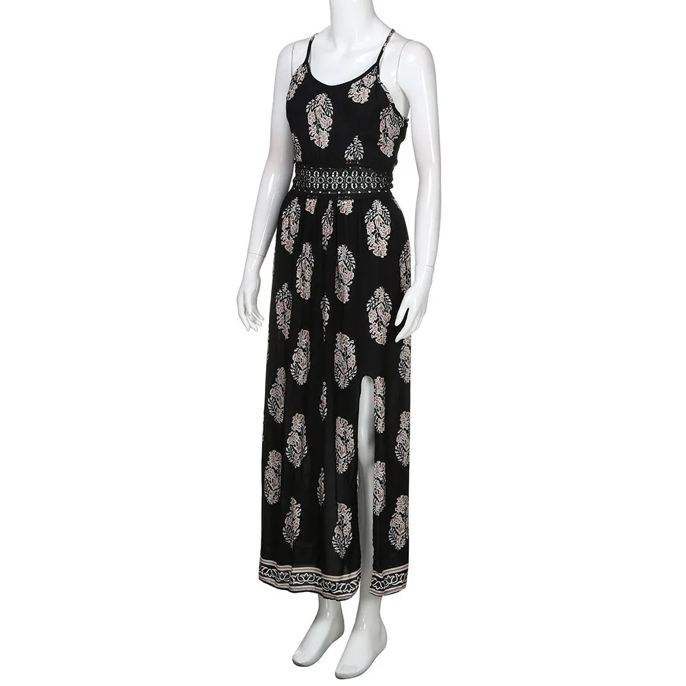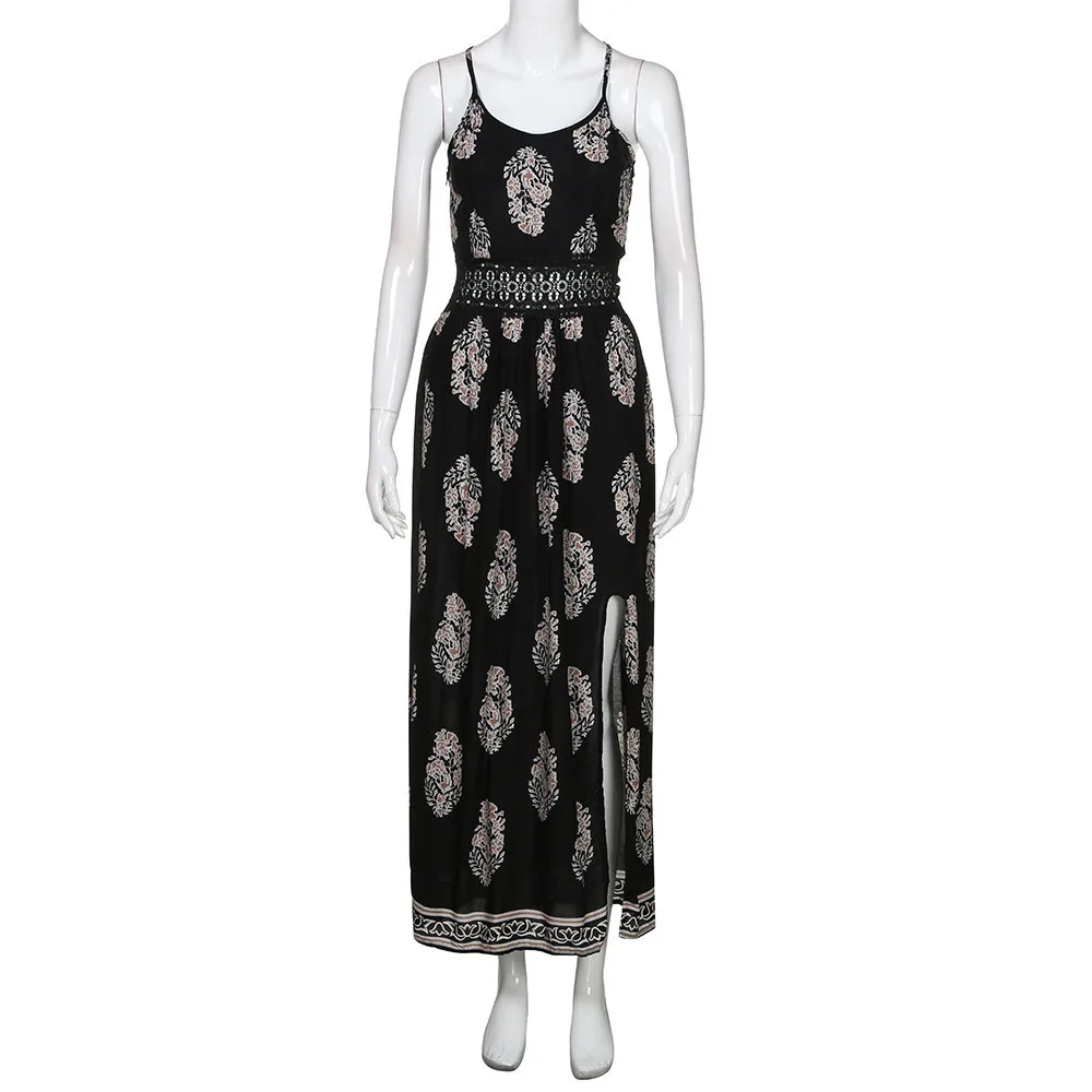 FeiTong Print fitted strap long dress women Backless sash casual summer dress 2018 Streetwear black long dress vestidos