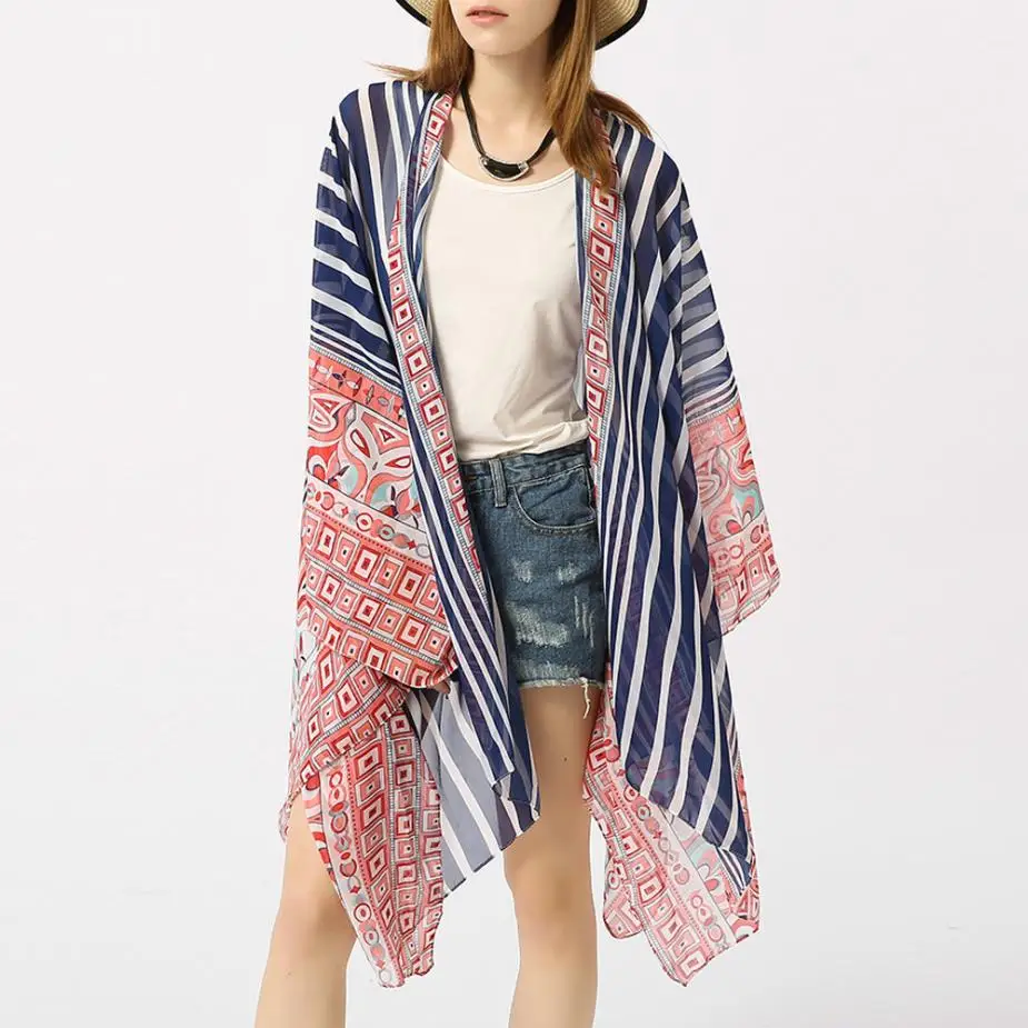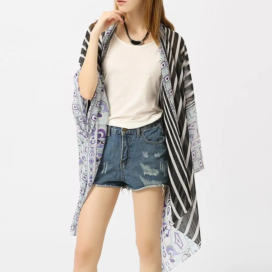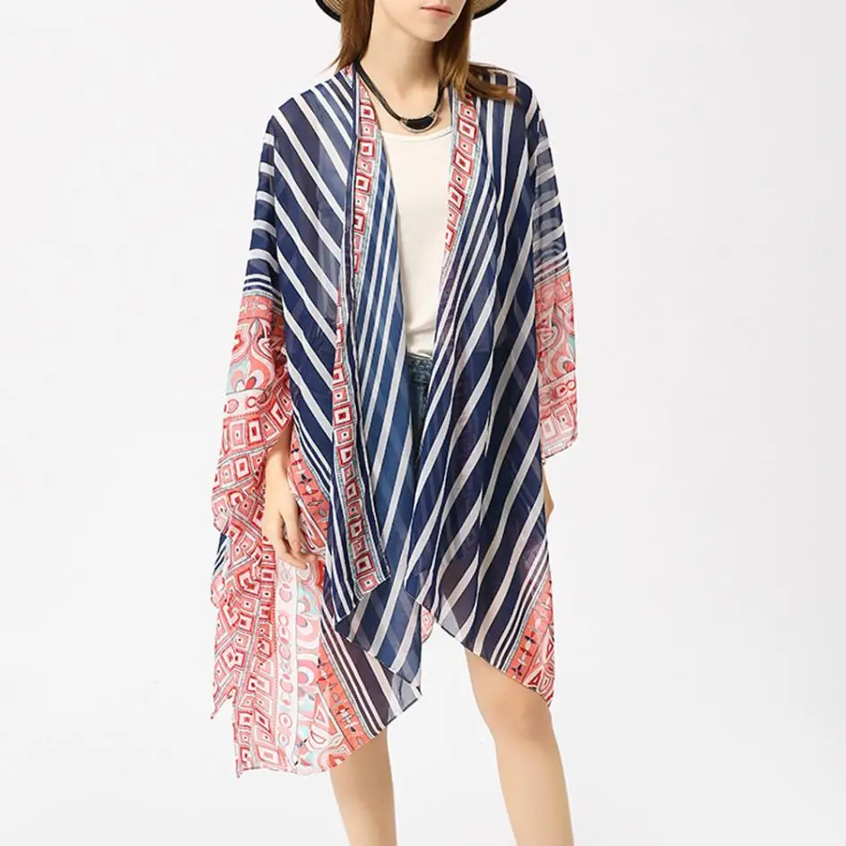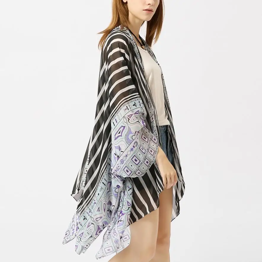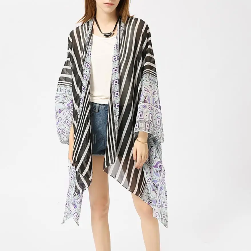 FeiTong Stripe Print Irregular Hem Chiffon Kimono Women Half Sleeve Bohemian Blouses Beach Summer New Female Casual Kimonos 2018