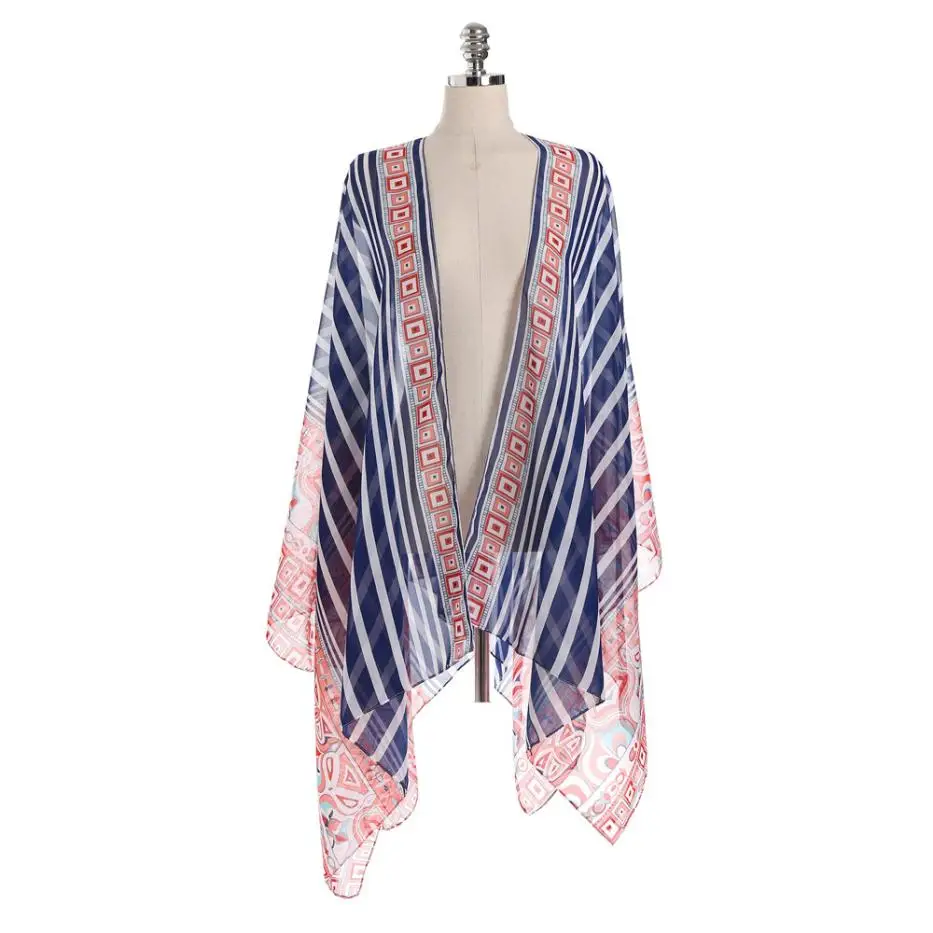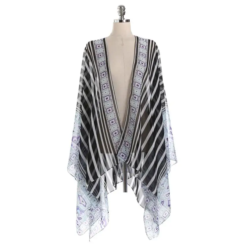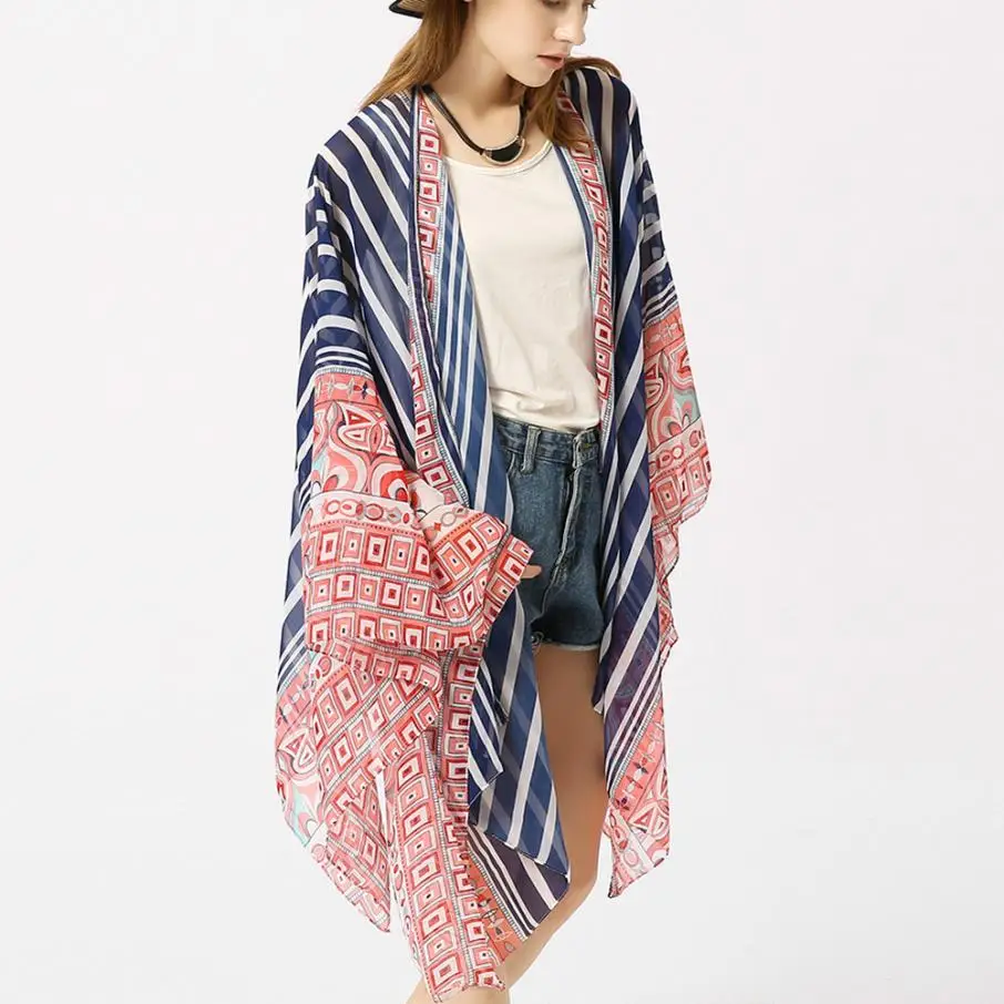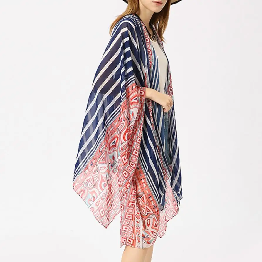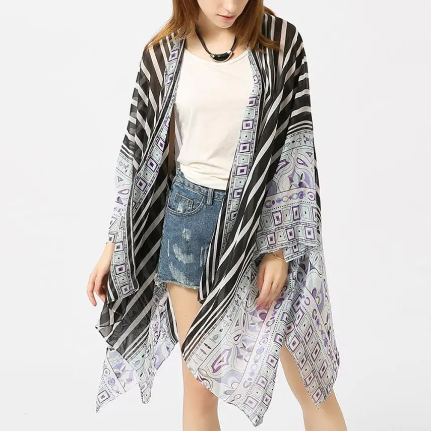 FeiTong Stripe Print Irregular Hem Chiffon Kimono Women Half Sleeve Bohemian Blouses Beach Summer New Female Casual Kimonos 2018