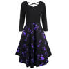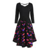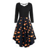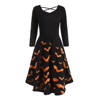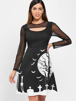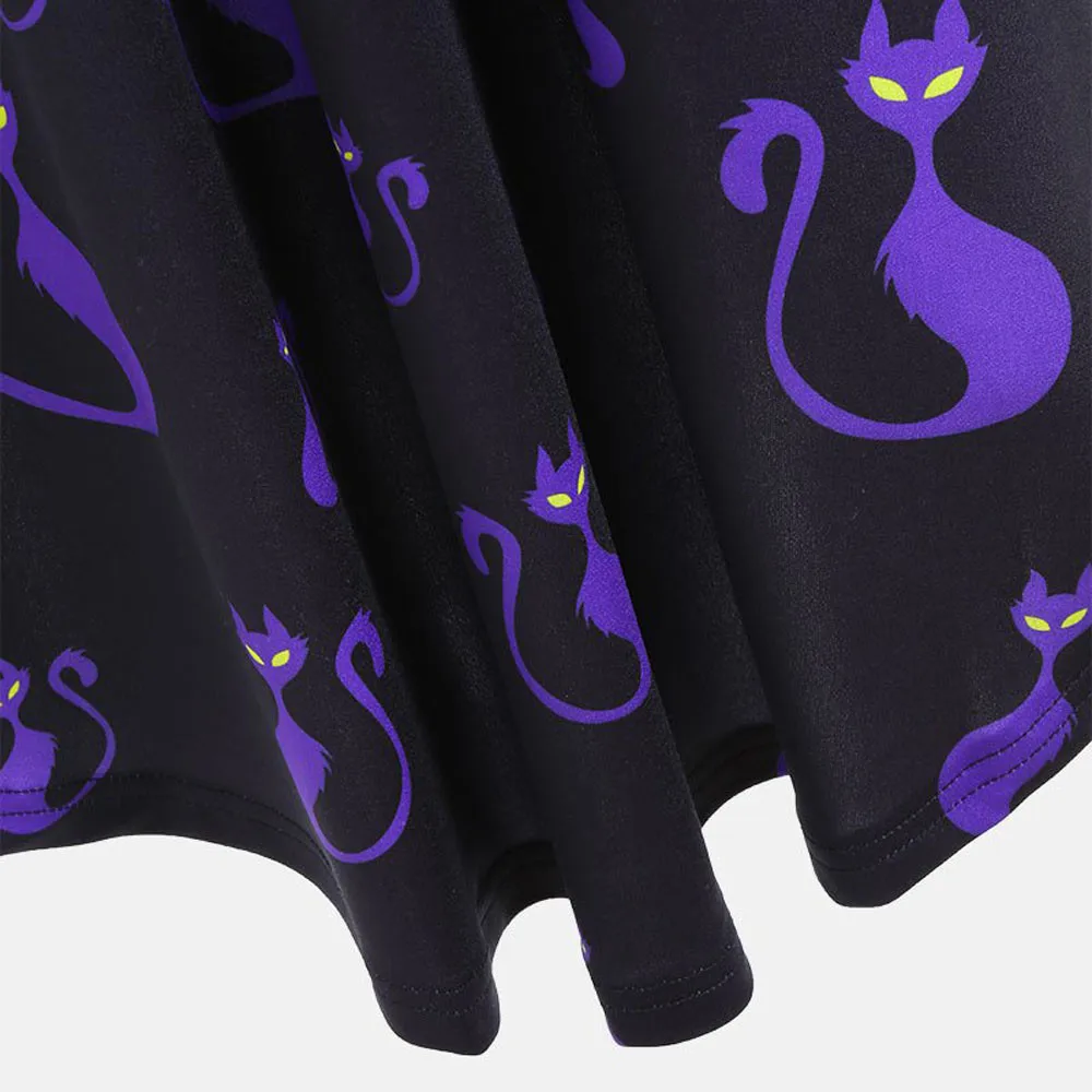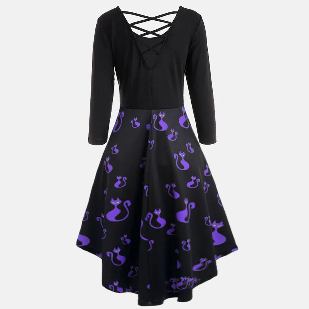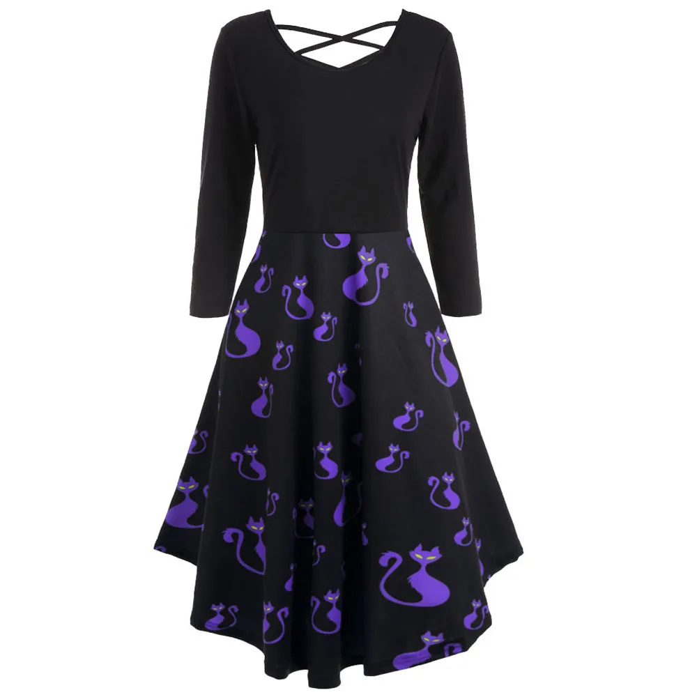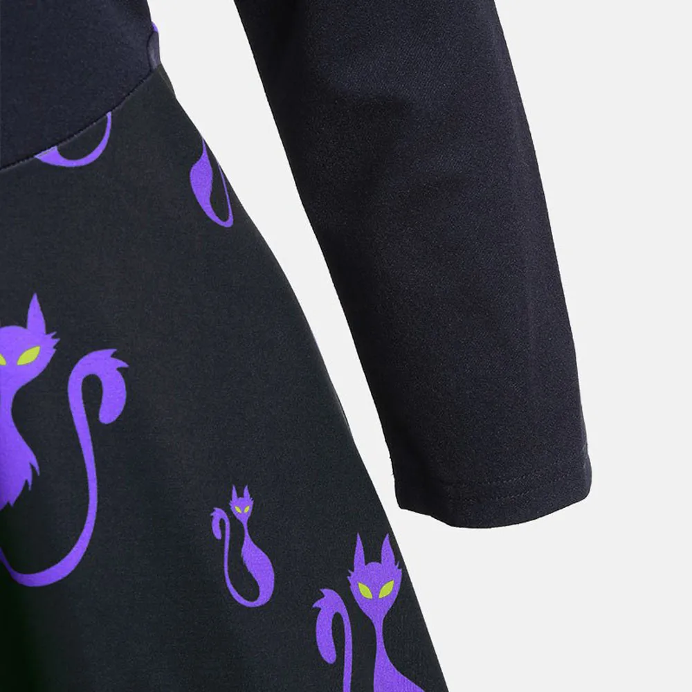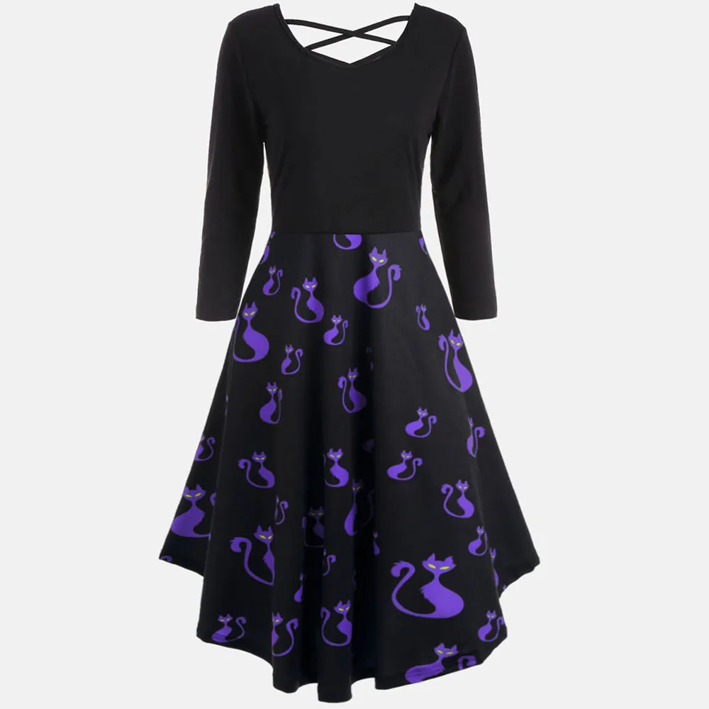 Women Long Sleeve Hollow Halloween Cat Print Flare Dress Party Casual Dresses