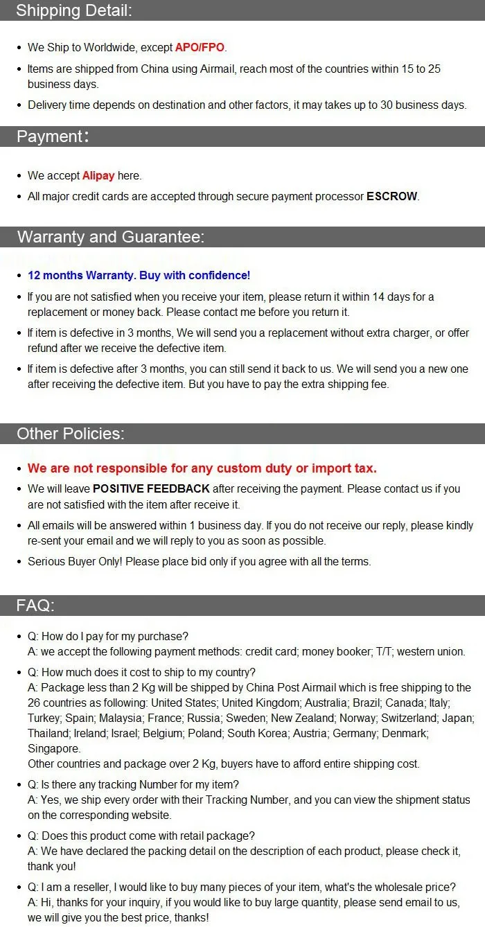 We are not responsible for any custom fees once the items have shipped. By purchasing our products, you consent that one or more packages may be shipped to you and may get custom fees when they arrive in your country.
